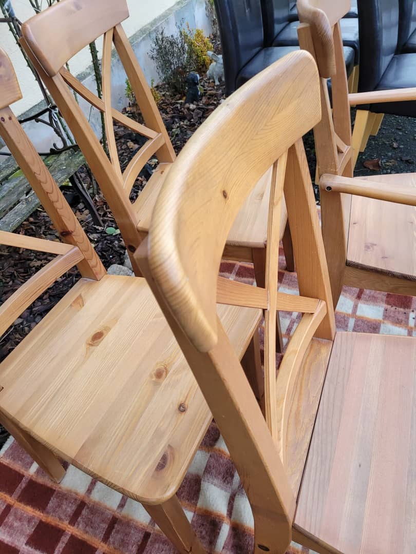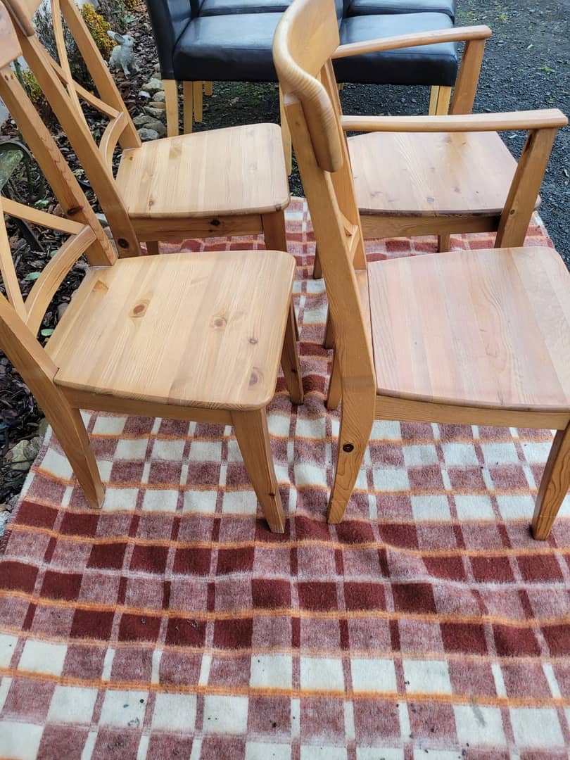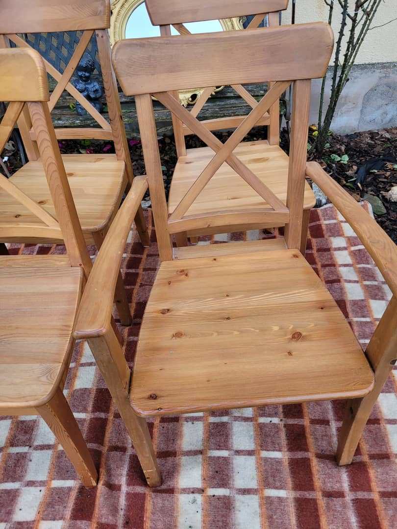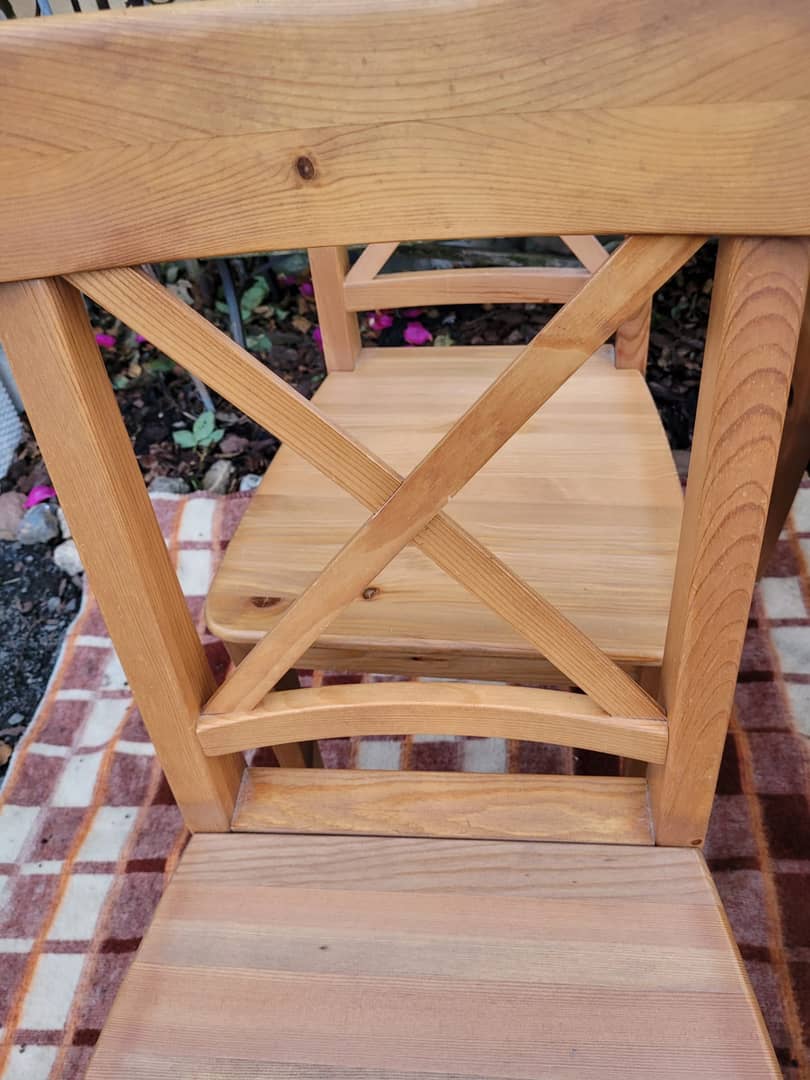 4 krzesła drewniane krzyżykowe, jedno z podłokietnikami . W dobrym stanie, nie zniszczone, nie rozchwiane. Cena za komplet 420 zł. Możliwy transport.