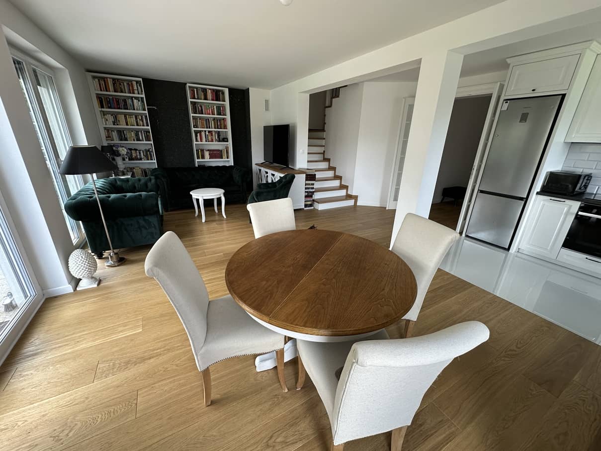 W cenie pozostaje zabudowa kuchenna ze sprzętem AGD, szafy w zabudowie oraz regał biblioteczny w salonie.