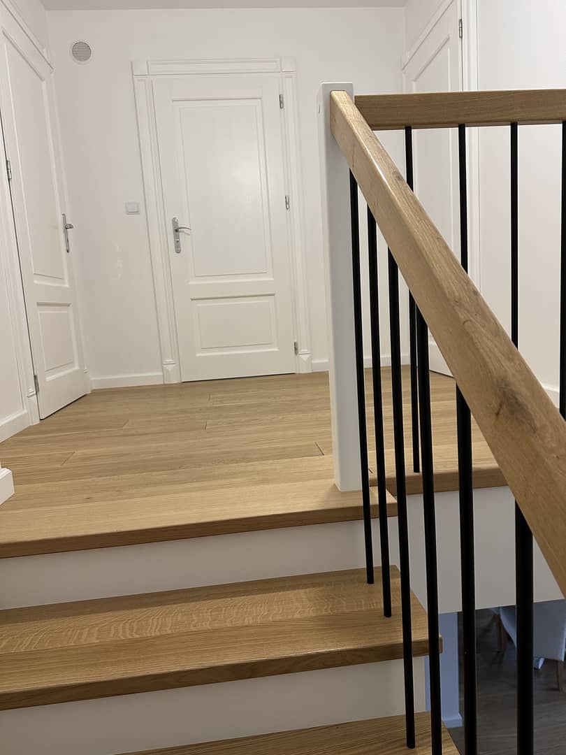 - dębowa okładzina schodów prowadzących na piętro