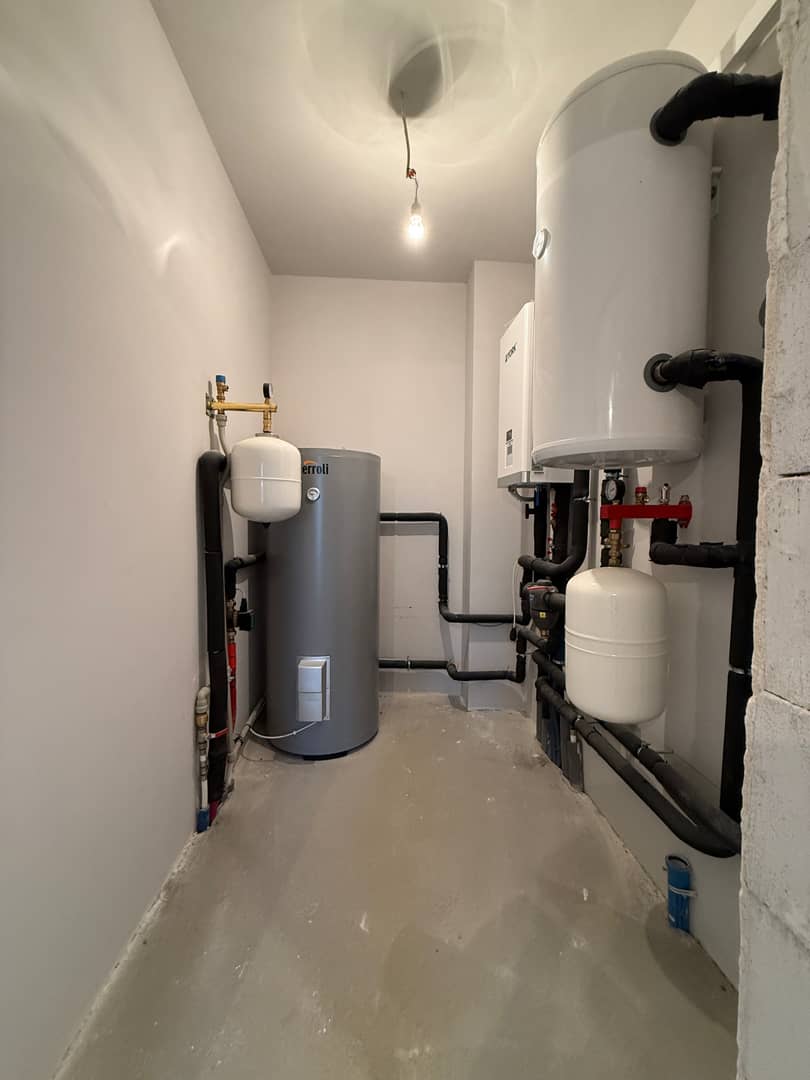 Ogrzewanie i ciepła woda - pompa ciepła. Podłogowe we wszystkich pomieszczeniach. Woda z wodociągu miejskiego. Szambo 10m3.