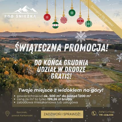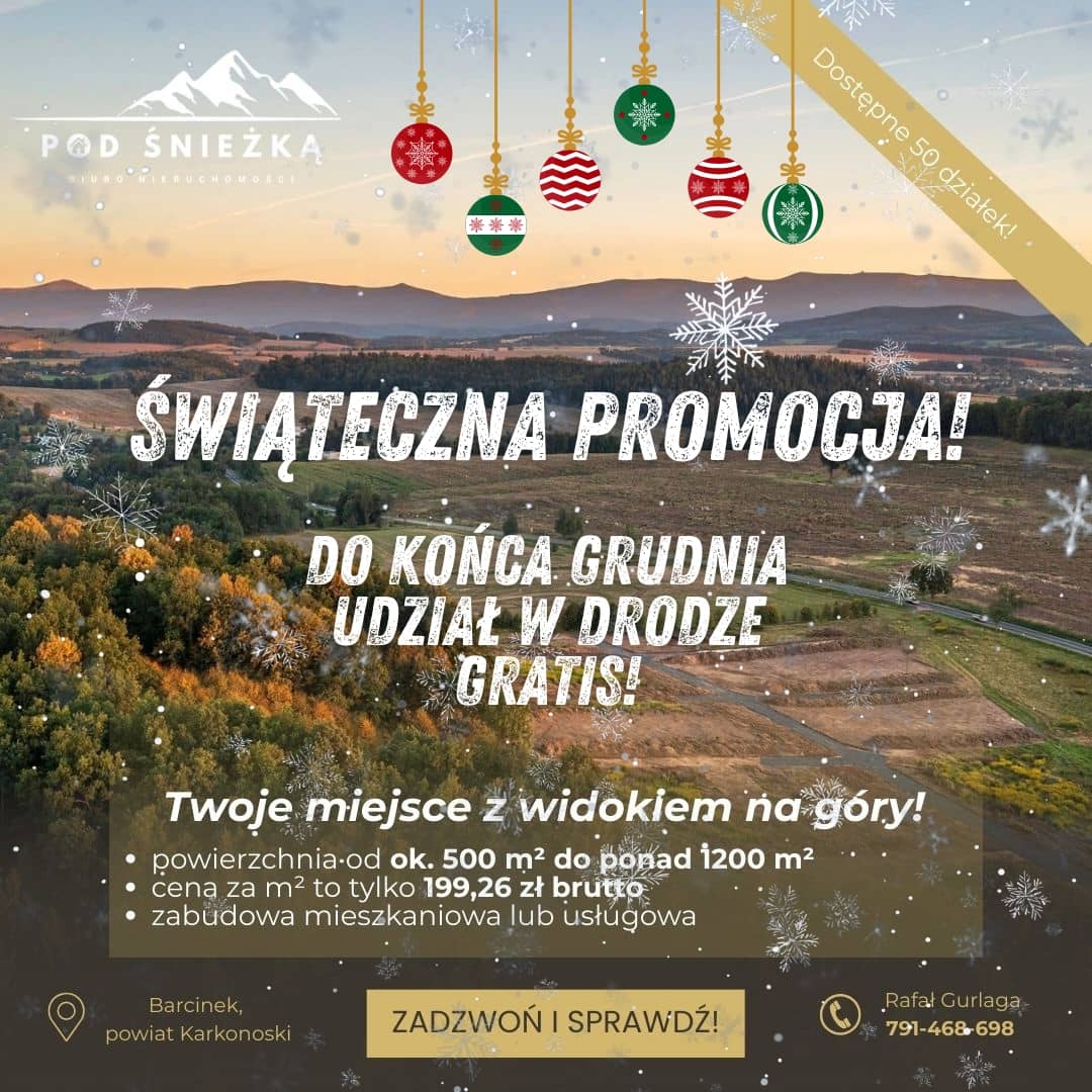 Biuro Nieruchomości Pod Śnieżką prezentuje wyjątkową inwestycję obejmującą 50 widokowych działek budowlanych położonych w miejscowości Barcinek, w gminie Stara Kamienica (powiat karkonoski, woj. dolnośląskie).
