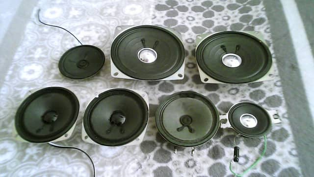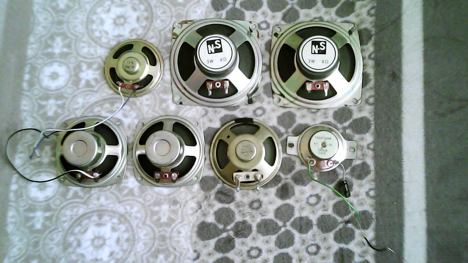 Sprzedam w zestawie głośniki pochodzące z różnych sprzętów rtv, W skład zestawu wchodzą 2 głośniki N-S 3W 4Ω, 2 głośniki bez żadnych oznaczeń, 1 mały głośnik 3W 4Ω, 1 głośnik 16Ω max 5W, 1 głośnik 8Ω 1W. Głośniki noszą niewielkie oznaki użytkowania. 30 zł.