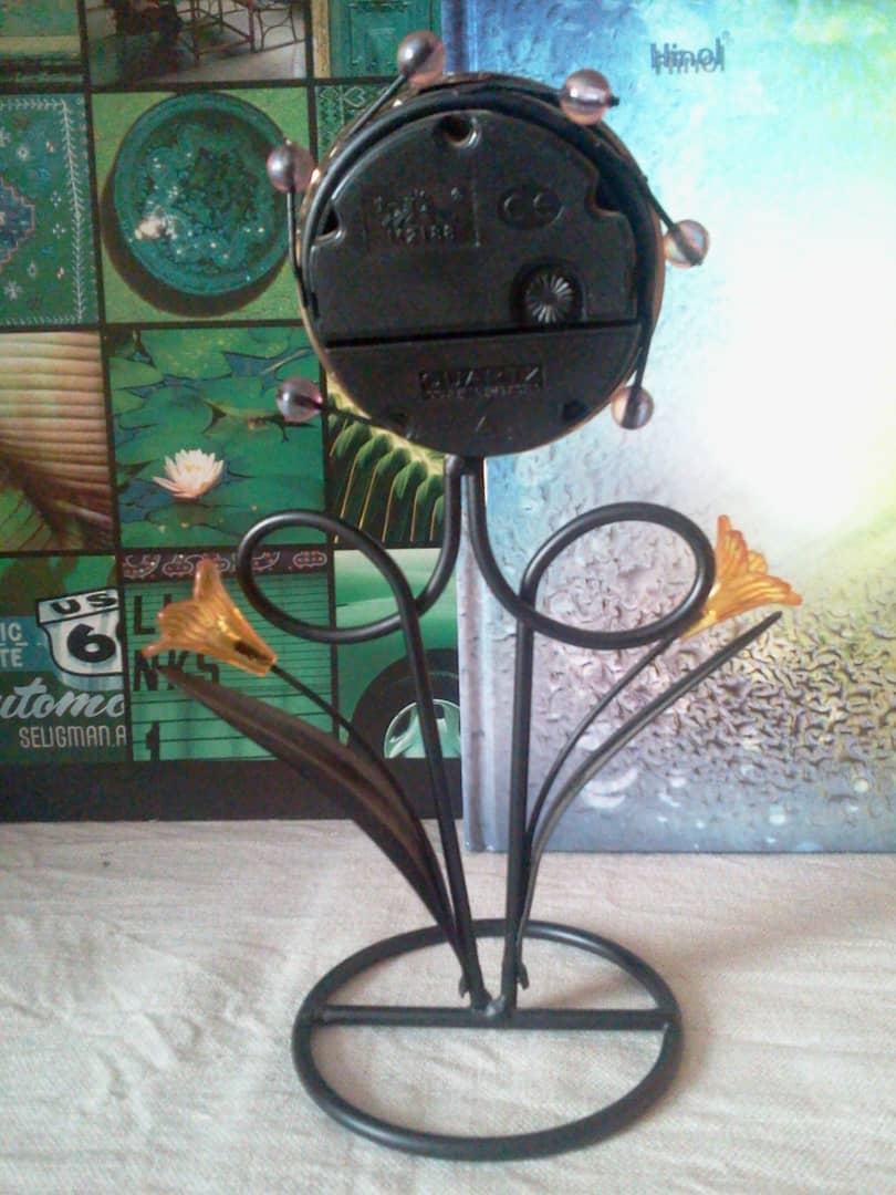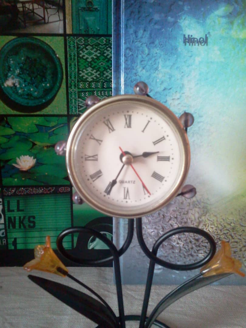 Sprzedam sprawny mały, dekoracyjny zegar który można postawić na stoliku, biurku itp. Posiada białą tarczę z czarnymi cyframi i wskazówkami. Osłona tarczy wykonana jest z tworzywa sztucznego. Metalowa podstawa składa się z zakrzywionych elementów w czarnym kolorze przypominających styl secesyjny lub art deco. 20 zł