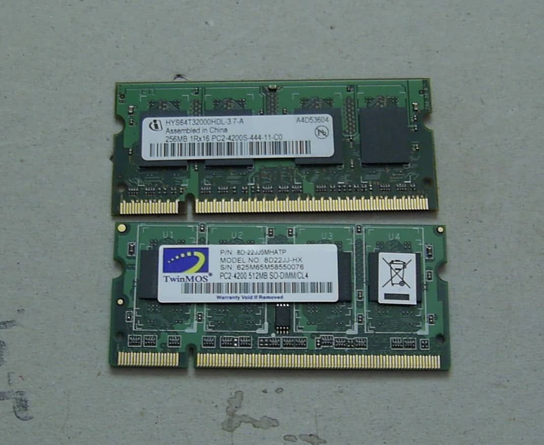 Sprzedam sprawny zestaw składający się z dwóch pamięci ram ddr 2 do laptopa firmy Twinmos pc2-4200 8D22JJ-HX 512 mb 533 MHz i Infineon HYS64T32000HDL-3.7-A 1Rx16 PC2-4200S-444-11- C0 256 mb 533 Mhz. 10 zł.