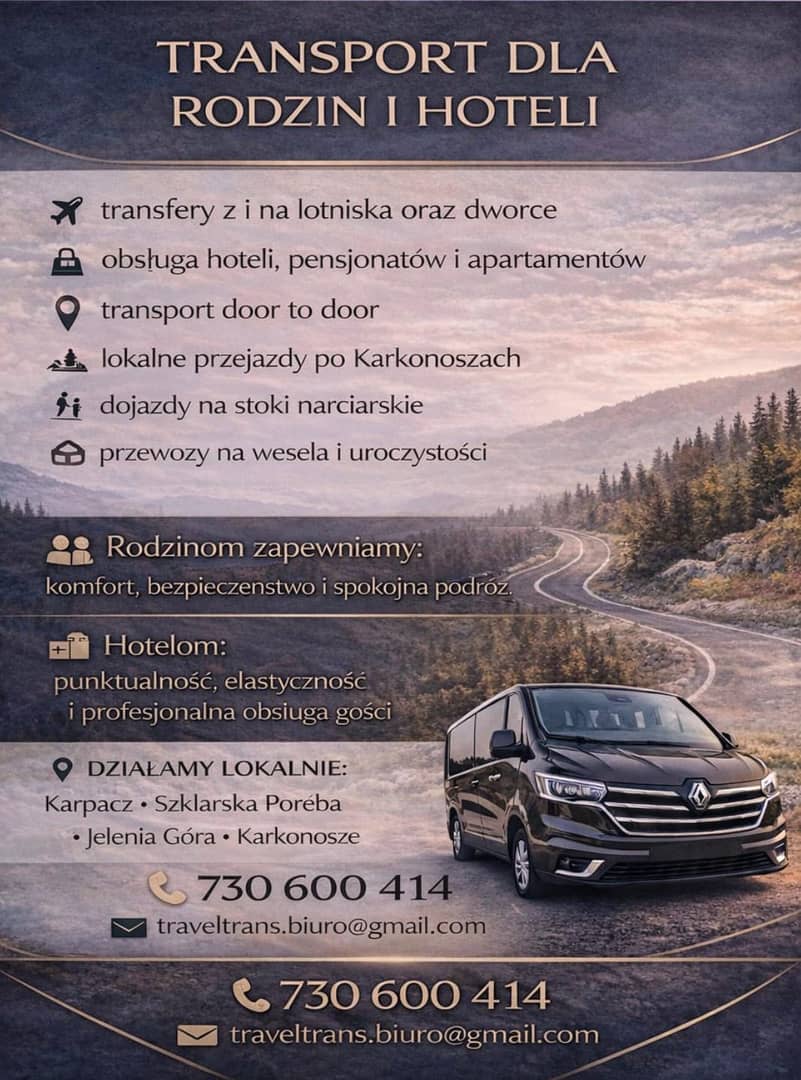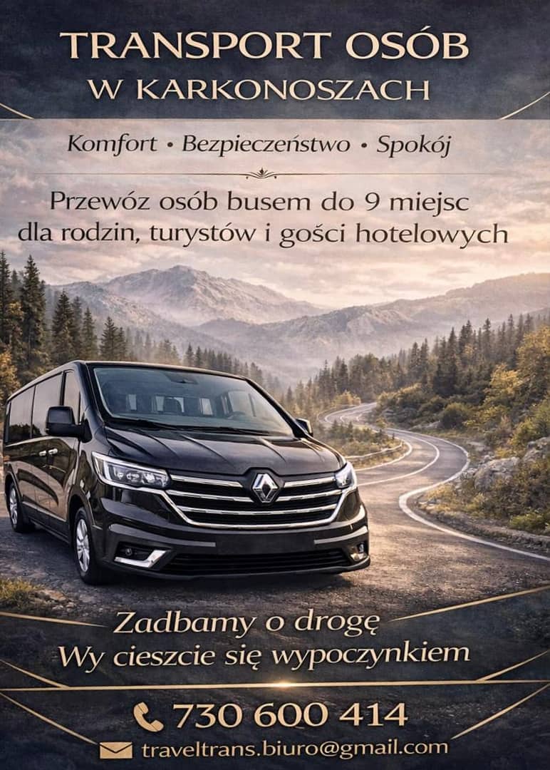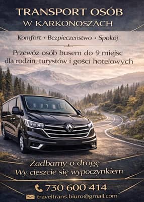 Oferujemy komfortowy i bezpieczny przewóz osób busem do 9 miejsc. Obsługujemy rodziny, turystów, hotele oraz imprezy okolicznościowe, w tym wesela. Realizujemy transfery na lotniska i dworce, przejazdy lokalne, transport door to door, wyjazdy na stoki oraz kursy nocne. Gwarantujemy punktualność, miłą atmosferę i nowoczesny pojazd.