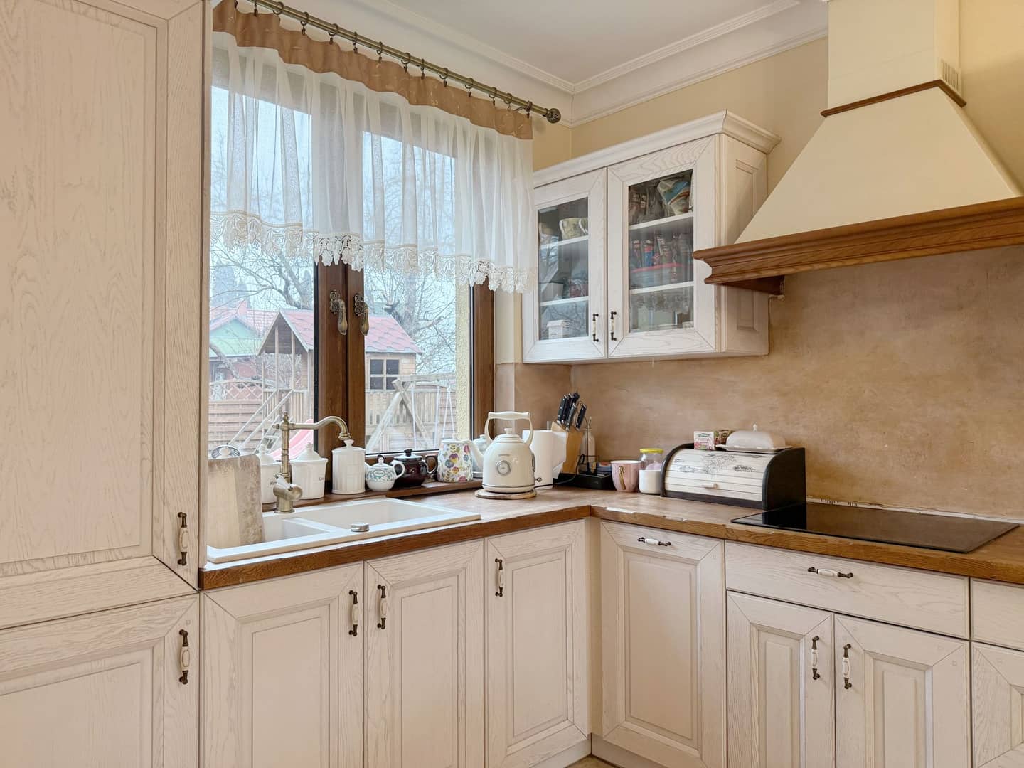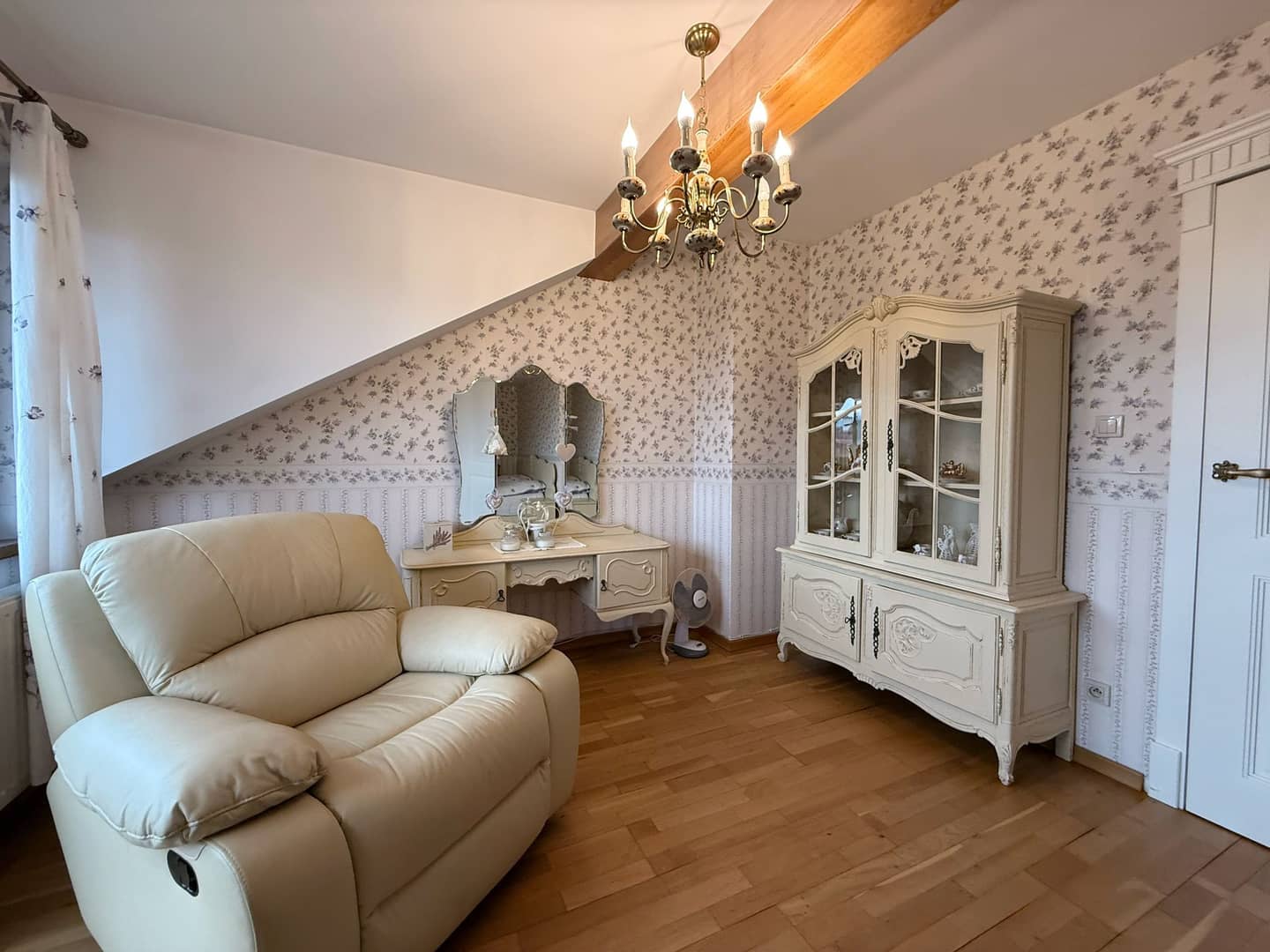 okna PCV, deska barlinecka, na parterze naturalny kamień – trawertyn, piec kaflowy robiony na zamówienie, schody dębowe, nowe instalacje, armatura włoska, dachówka betonowa.