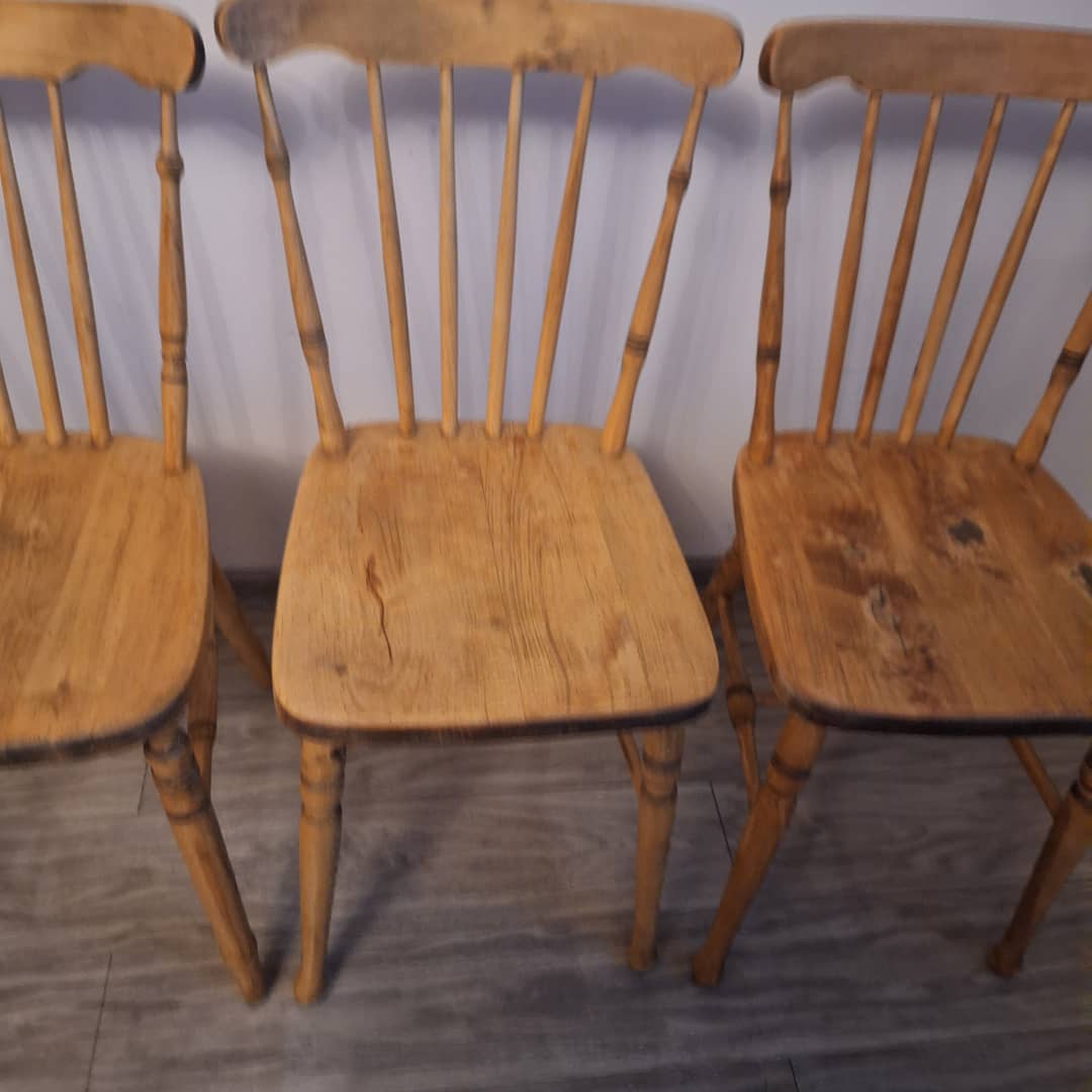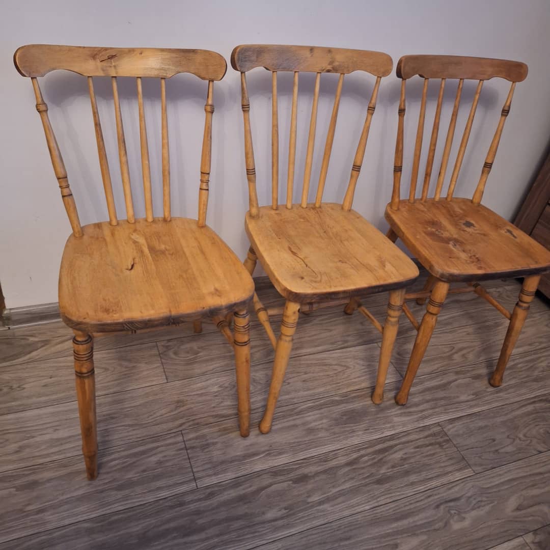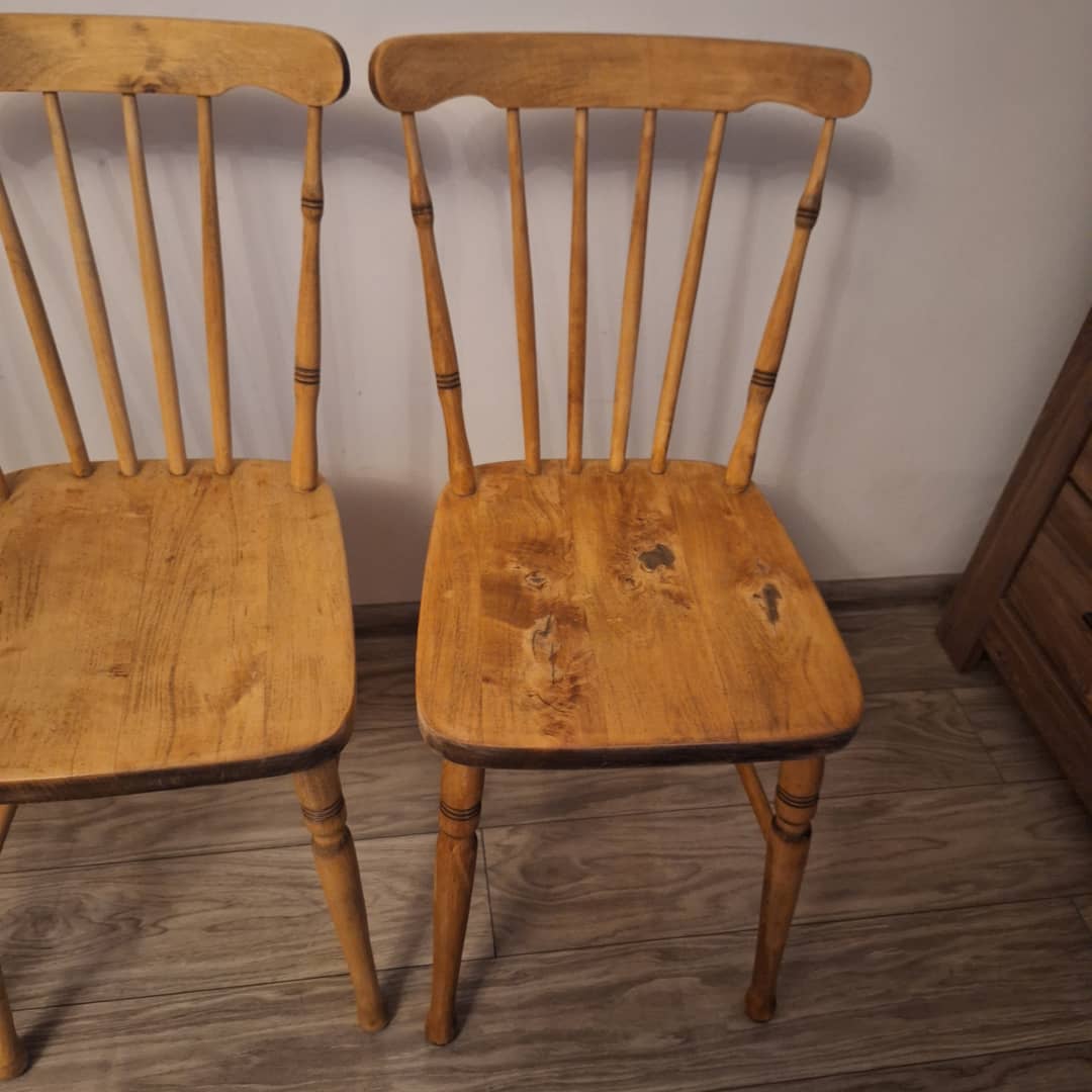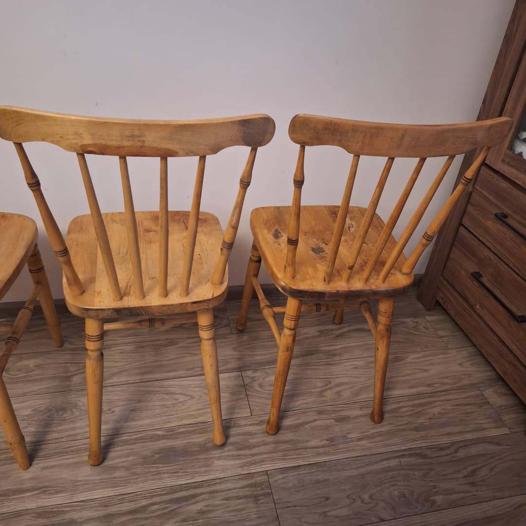 Trzy stare krzesła drewniane, widoczne ślady użytkowania, mniejsze wielkością, ale stabilne, nie rozchwiane ,bez uszczerbień, wygodne, z profilowanym oparciem i siedziskiem, ozdobne toczenia. Możliwy transport. Cena 140 zł za trzy sztuki..