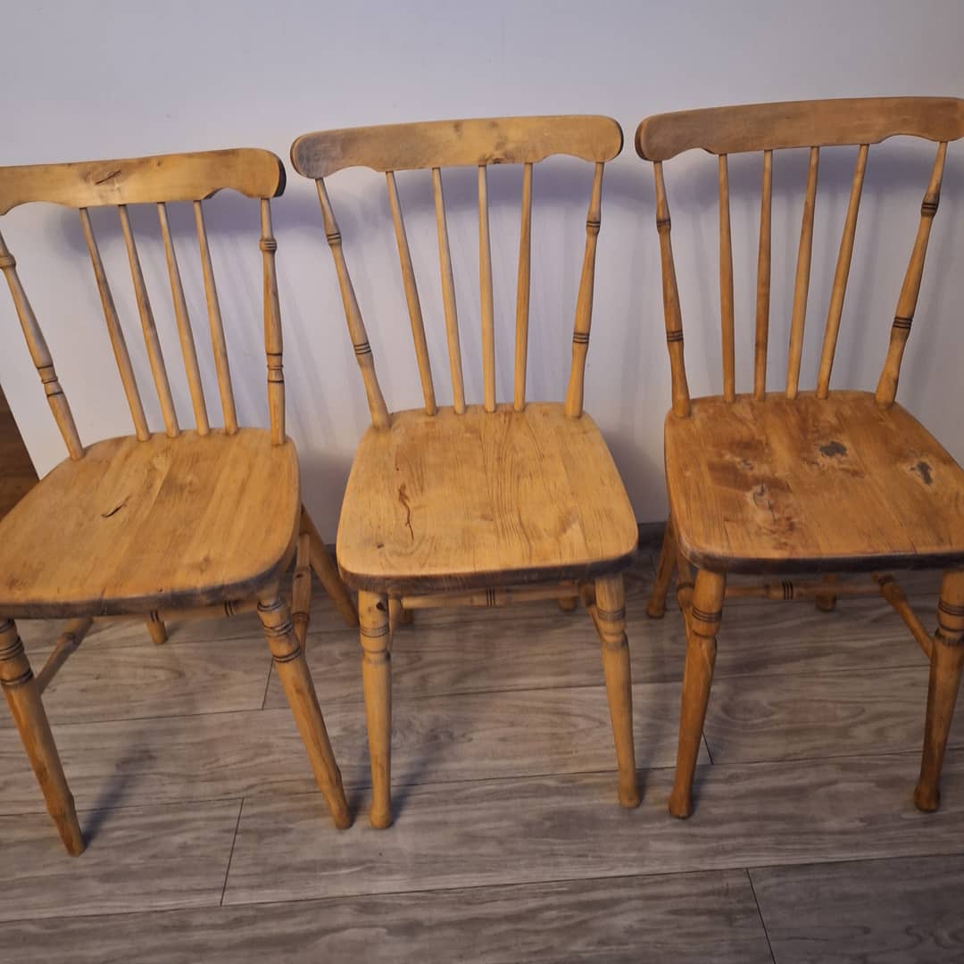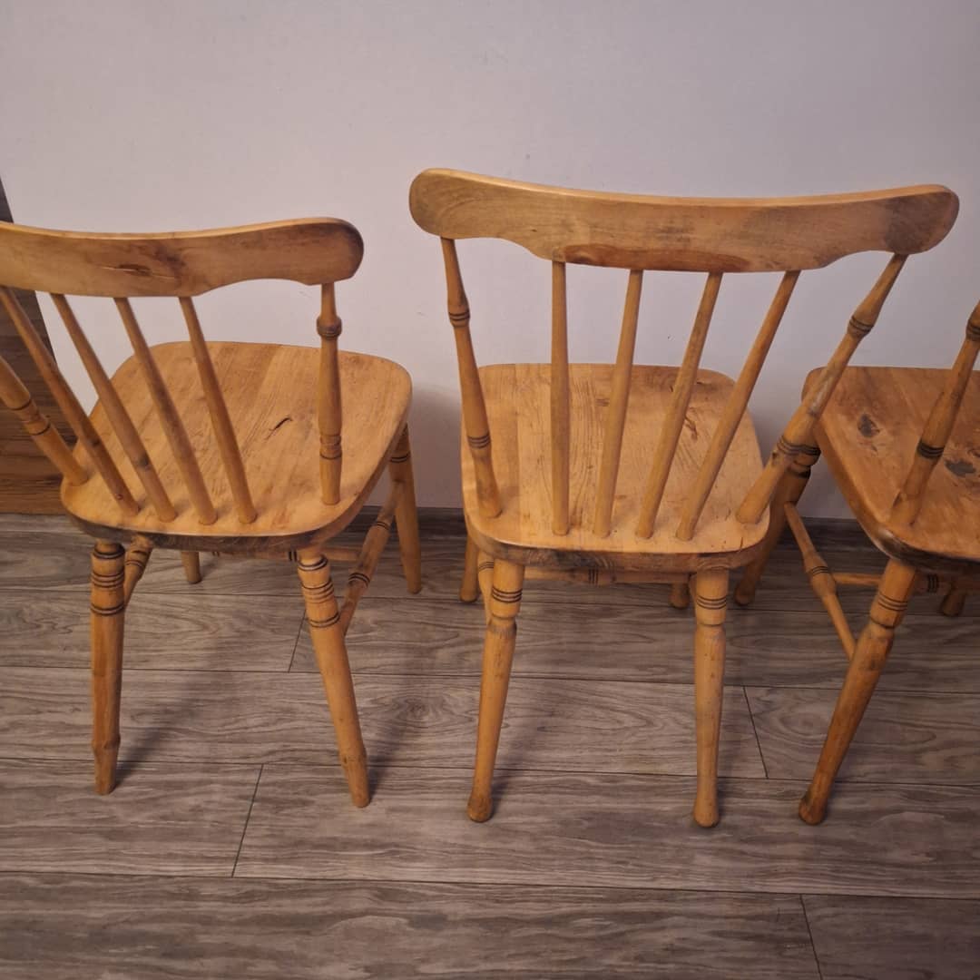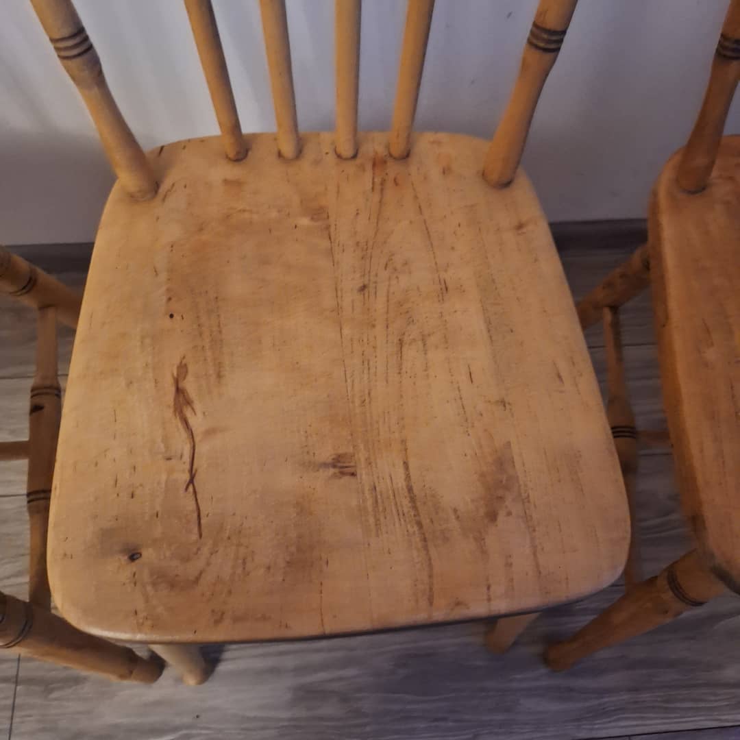 Trzy stare krzesła drewniane, widoczne ślady użytkowania, mniejsze wielkością, ale stabilne, nie rozchwiane ,bez uszczerbień, wygodne, z profilowanym oparciem i siedziskiem, ozdobne toczenia. Możliwy transport. Cena 140 zł za trzy sztuki..