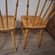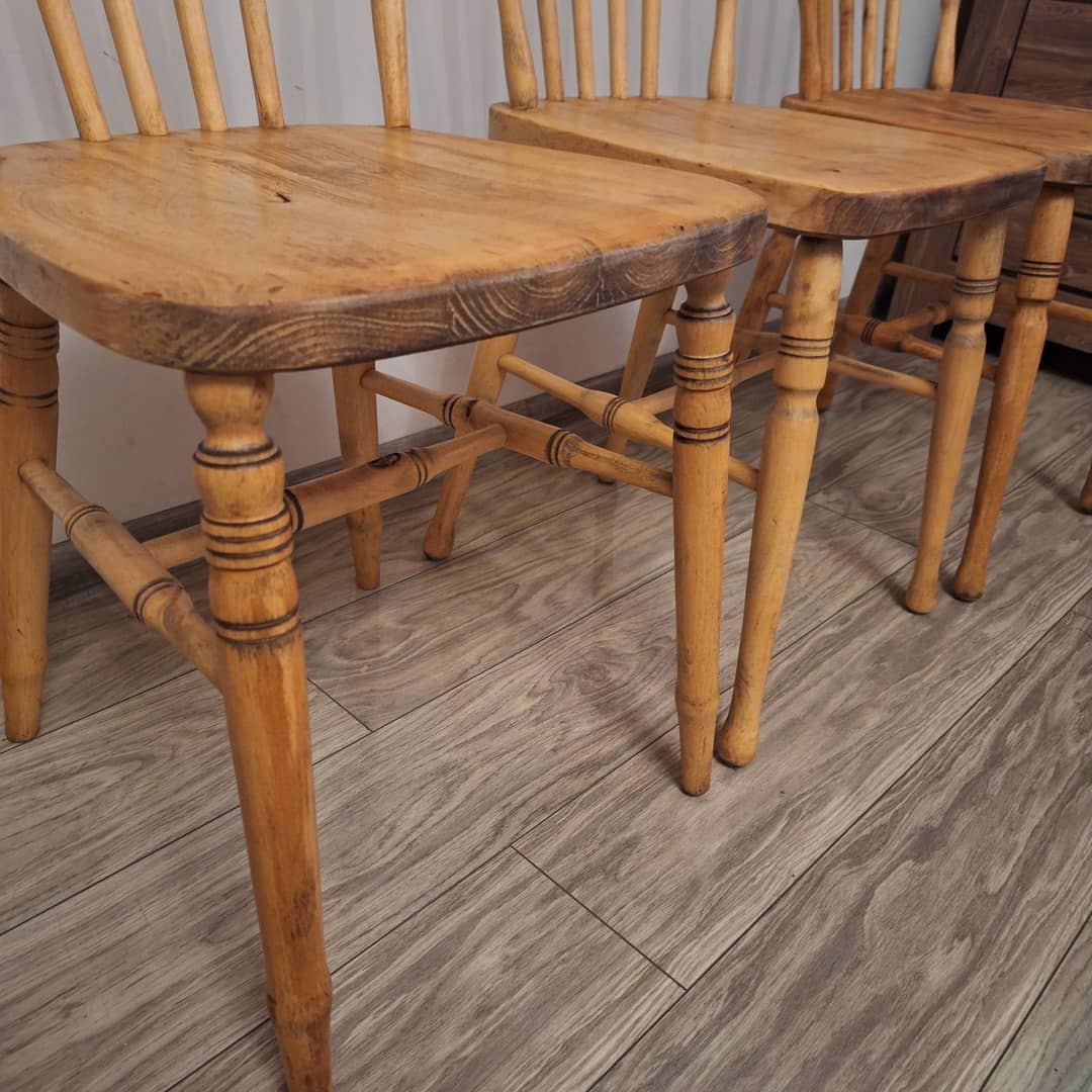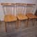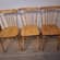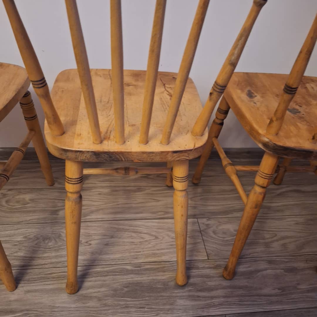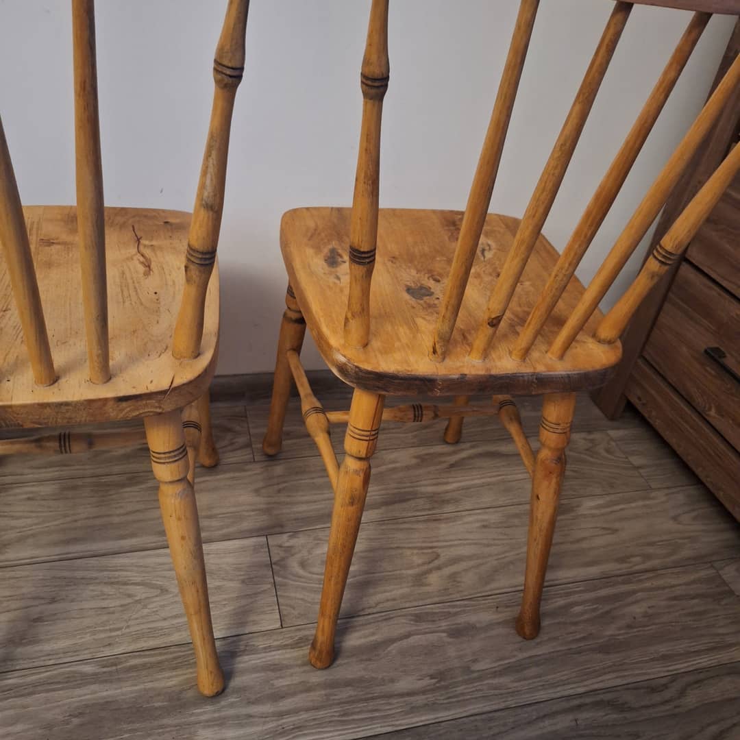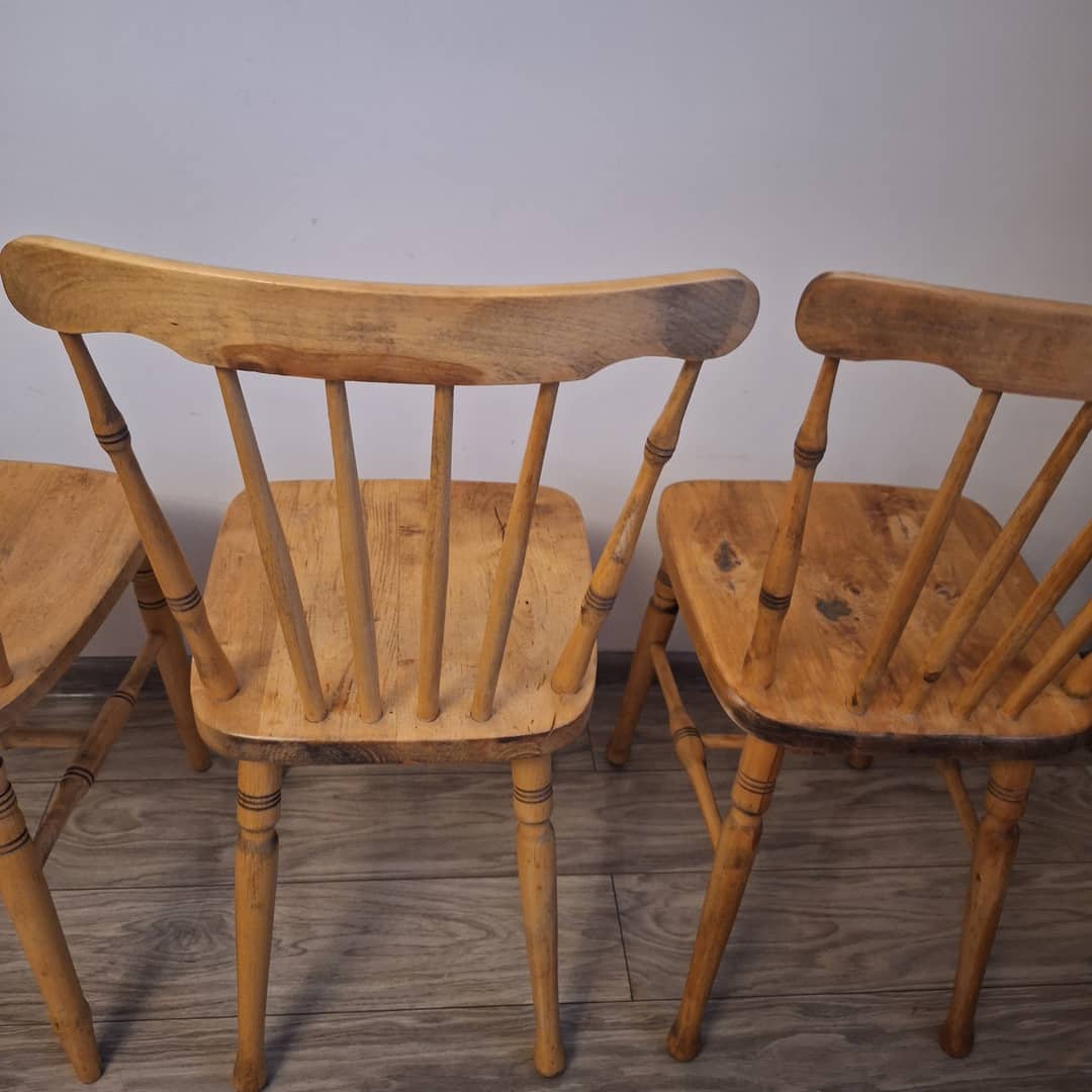 Trzy stare krzesła drewniane, widoczne ślady użytkowania, mniejsze wielkością, ale stabilne, nie rozchwiane ,bez uszczerbień, wygodne, z profilowanym oparciem i siedziskiem, ozdobne toczenia. Możliwy transport. Cena 140 zł za trzy sztuki..