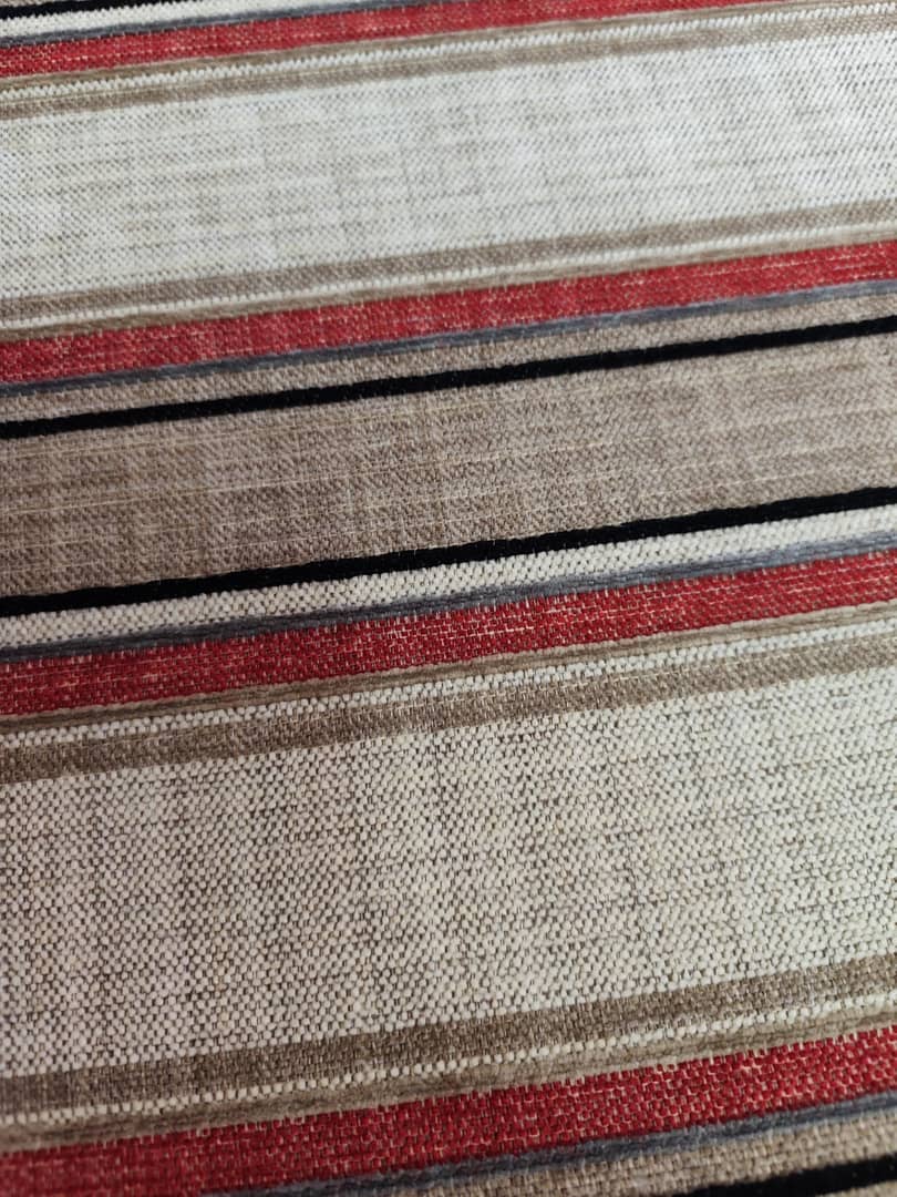 Tapicerka w klasyczne pasy w odcieniach beżu, czerwieni i czerni nadaje jej ponadczasowy wygląd, który dobrze wpasuje się zarówno w tradycyjne, jak i bardziej nowoczesne wnętrza. Boczne oparcie zwiększa komfort podczas leżenia lub siedzenia.