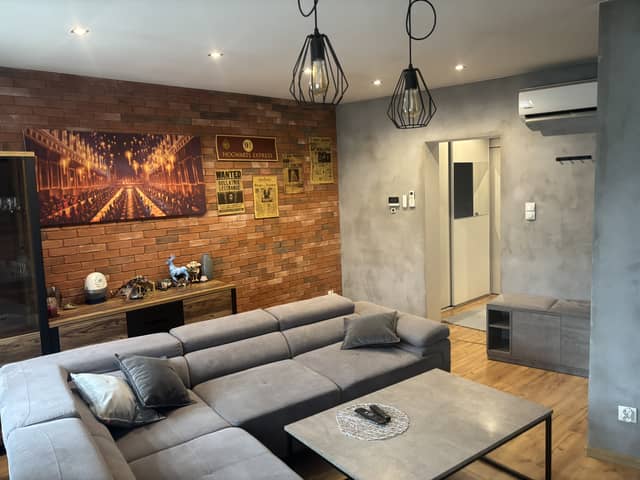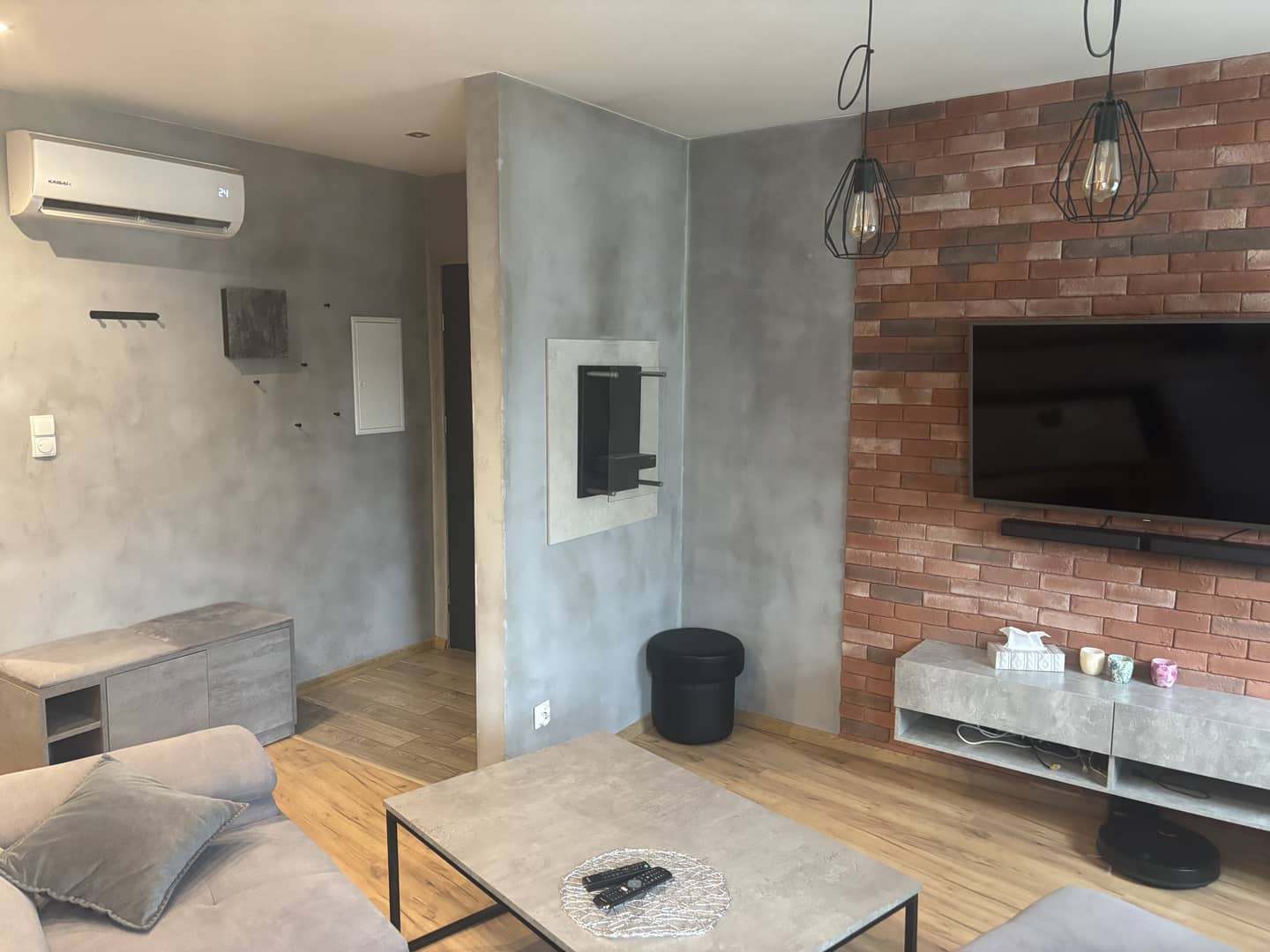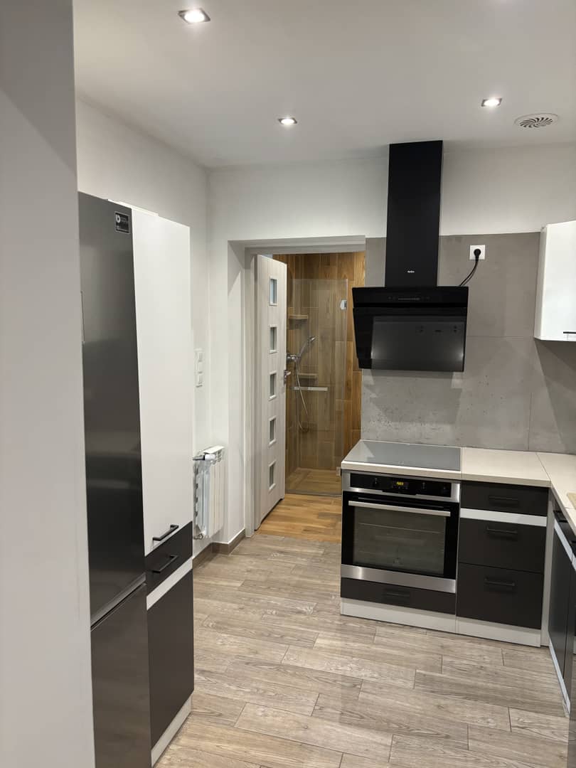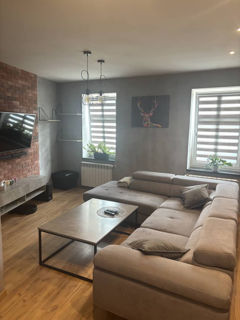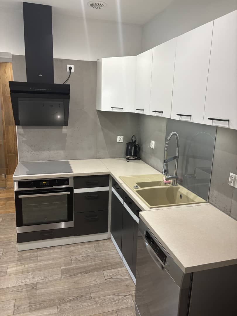 Mieszkanie w pełni wyposażone (m.in. narożnik, łóżko, komody, lodówka, zmywarka, płyta indukcyjna, okap, piekarnik, pralka, suszarka elektryczna, 2x TV, soundbar) oraz zamontowany wiszący biokominek.
