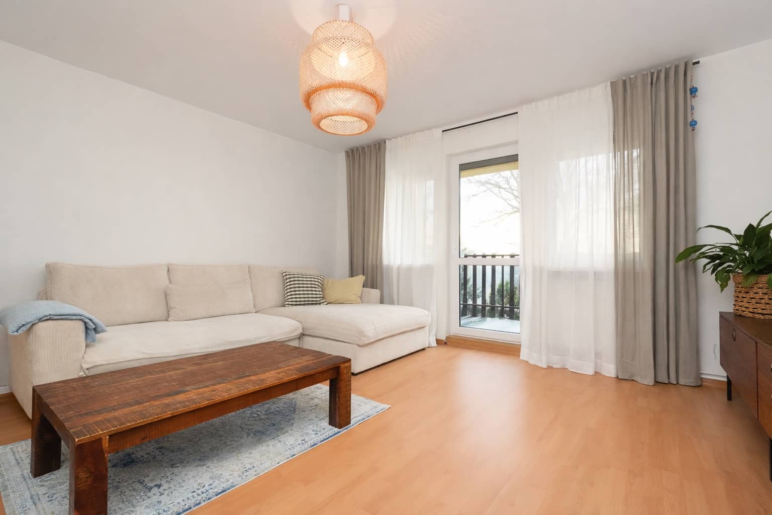 jasna, słoneczna przestrzeń z pięknymi drewnianymi belkami