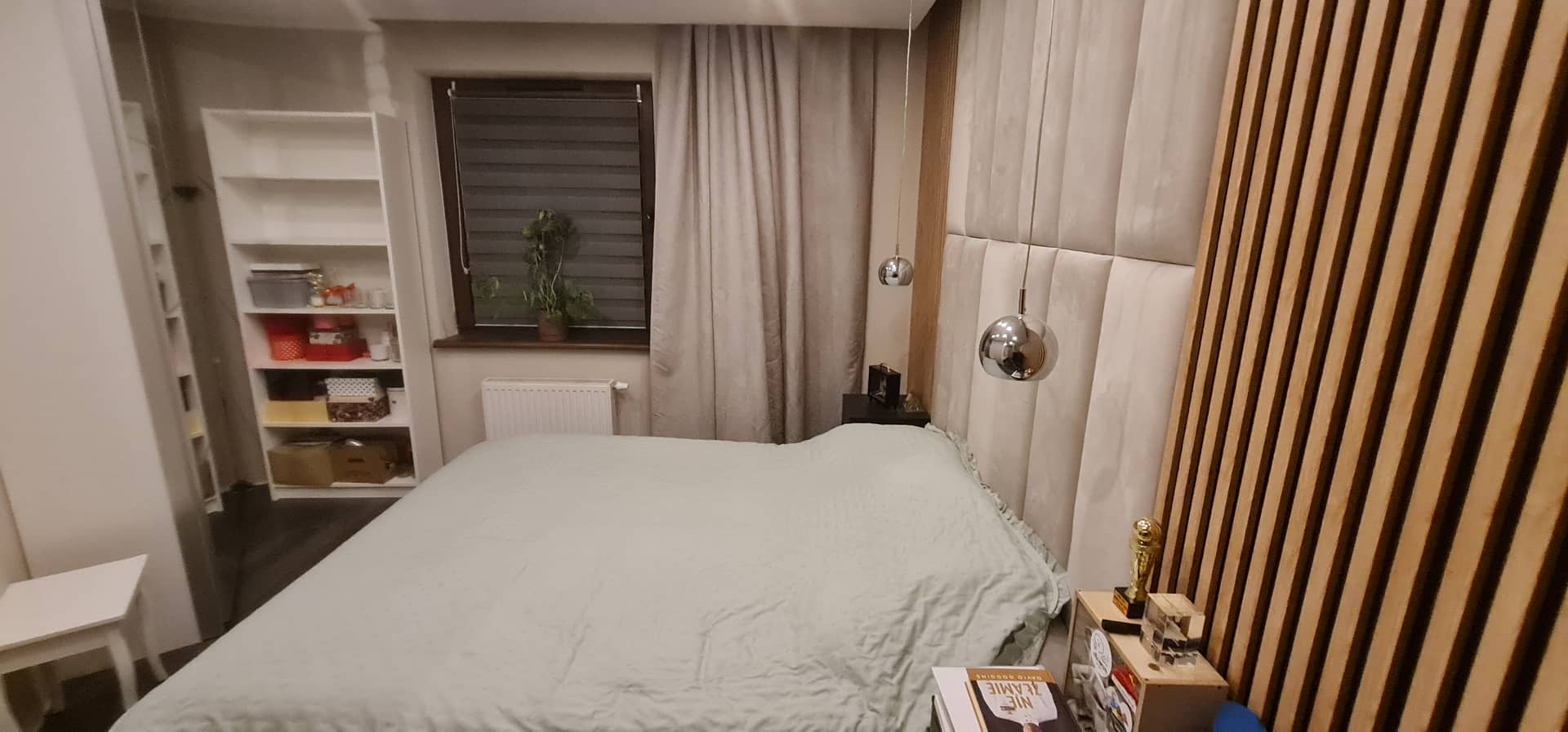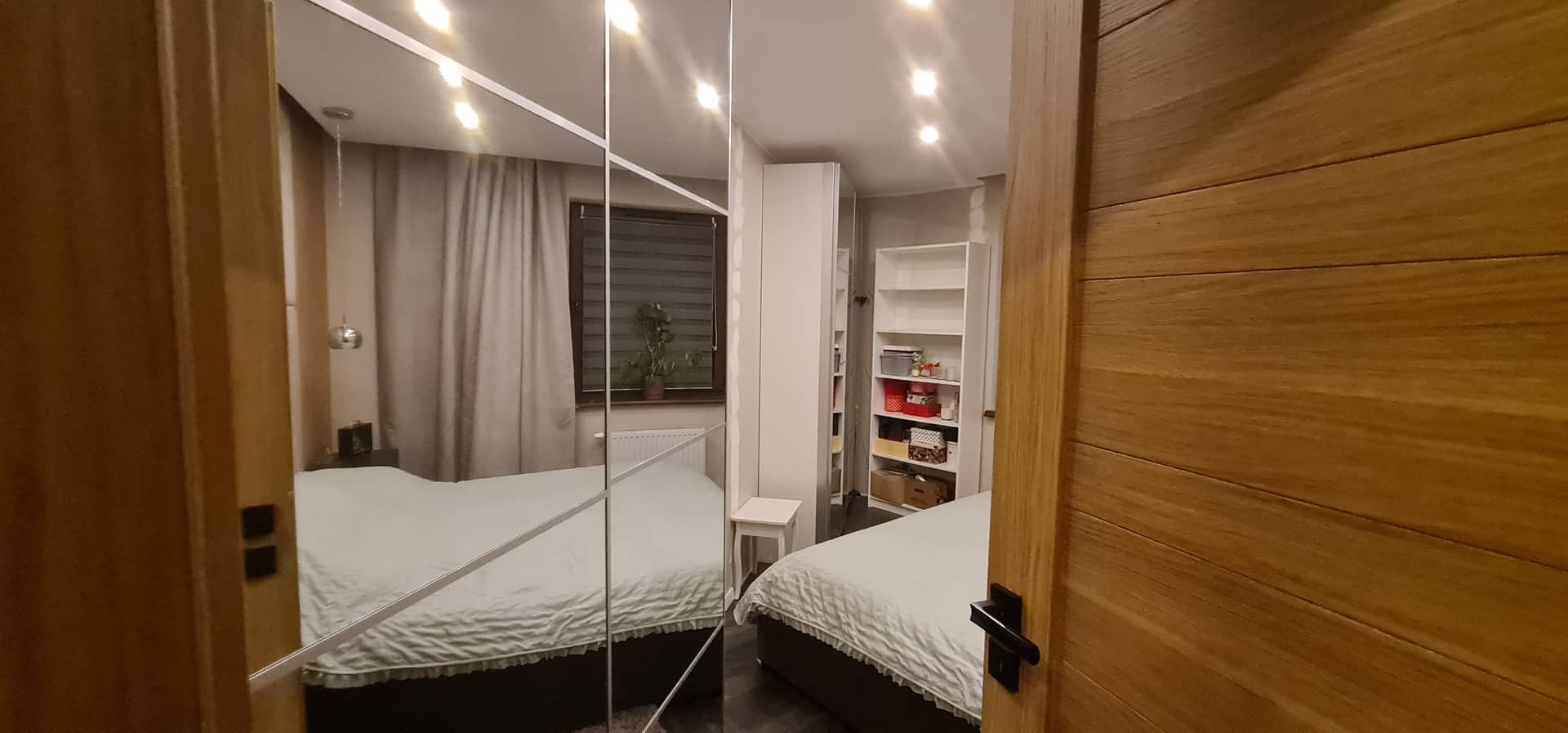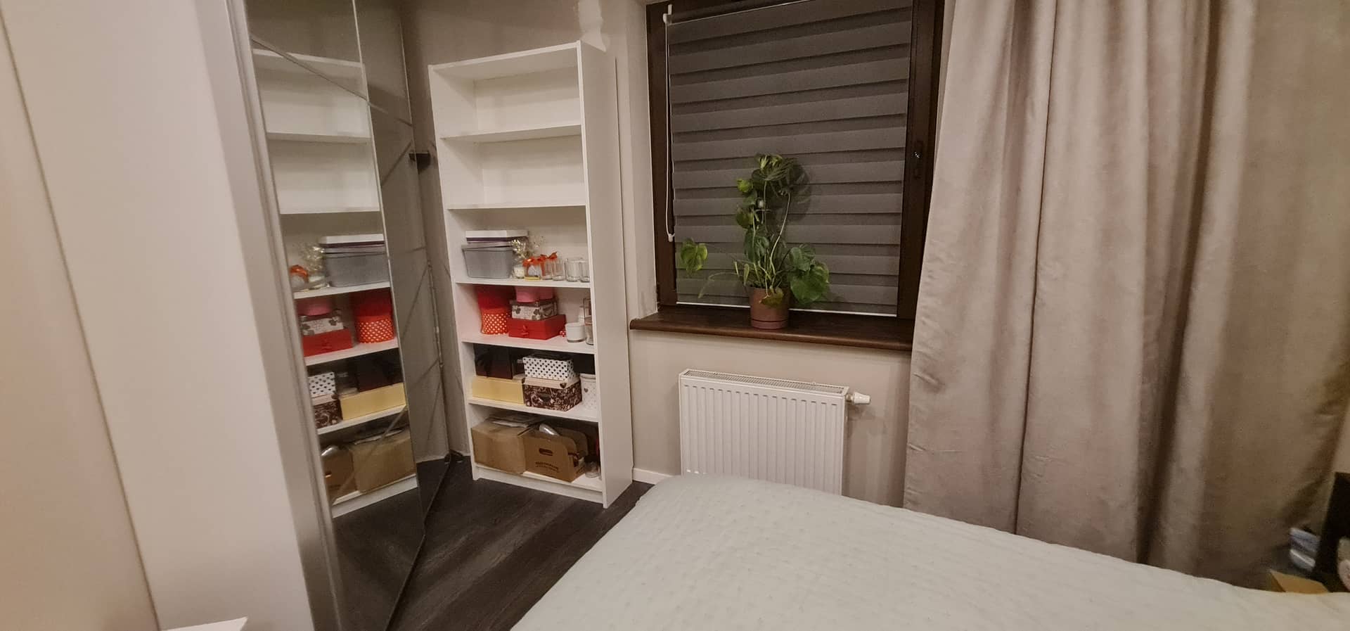 Na oknach zamontowano rolety dzień/noc oraz eleganckie drewniane żaluzje, a w przedpokoju i sypialni znajdują się pojemne, funkcjonalne szafy.