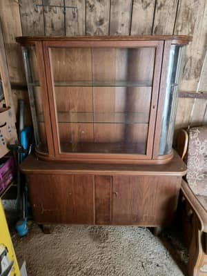 Drewniany kredens składający się z dwóch części o zaokrąglonym kształcie.