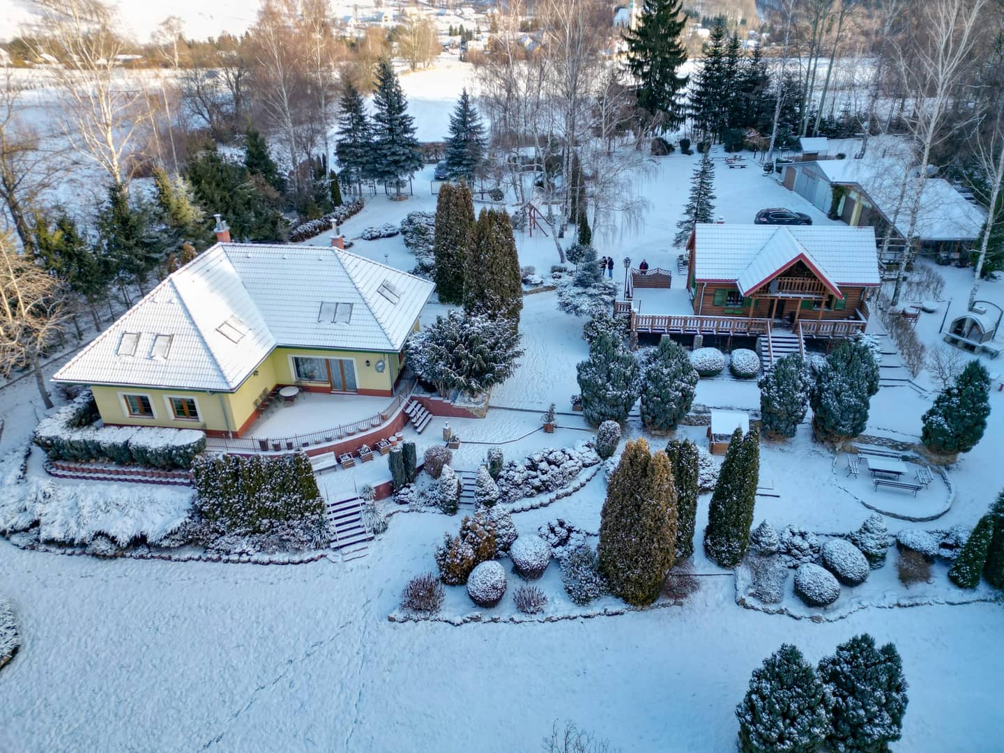 Budynek drewniany z 2007r o powierzchni 45m2– idealny jako dom gościnny lub pod wynajem. Na parterze znajduje się salon z kominkiem, jadalnia, otwarta kuchnia oraz łazienka. Na piętrze znajdują się dwie sypialnie. Z tarasu domku piękny widok na działkę, las i góry.