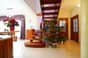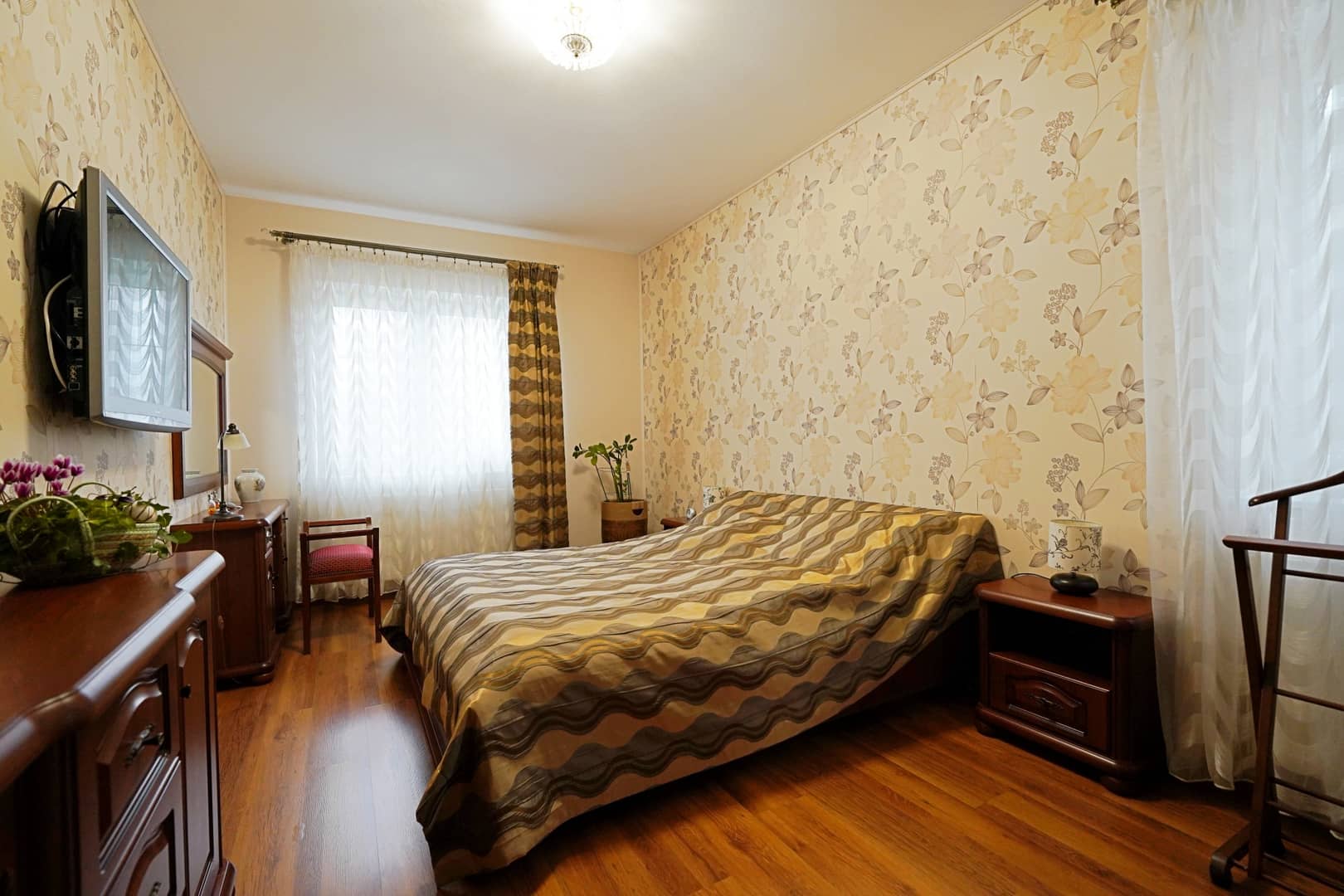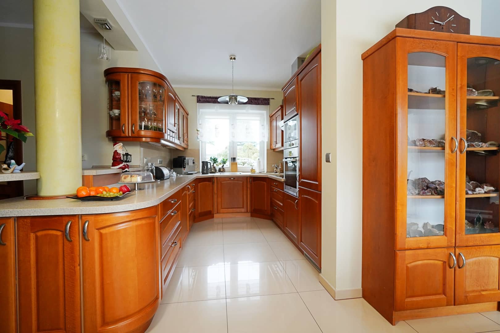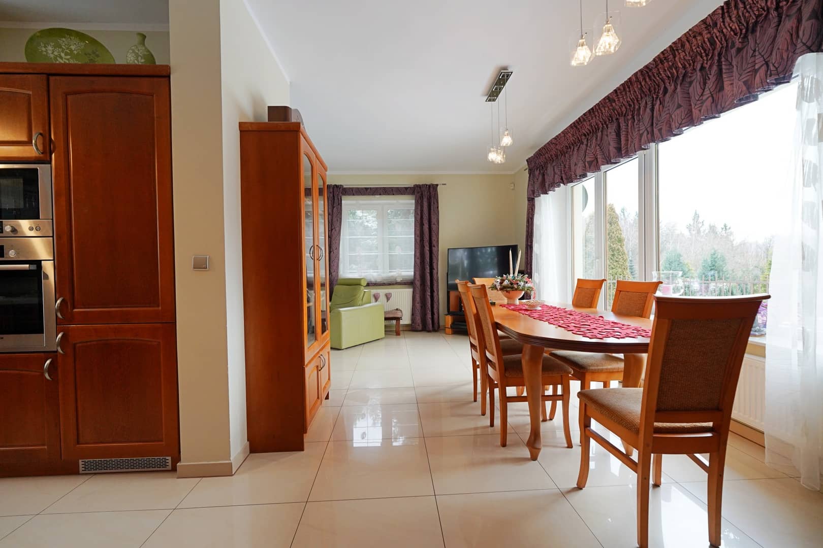 Na parterze znajduje się salon z kominkiem, jadalnia z wyjściem na taras, otwarta kuchnia, dwa pokoje, łazienka, spiżarka i kotłownia. Na piętro prowadzą drewniane schody i tutaj znajdują się dwie sypialnie (każda z własną garderobą), łazienka, pralnia, wydzielona strefa fitness oraz dodatkowa garderoba.