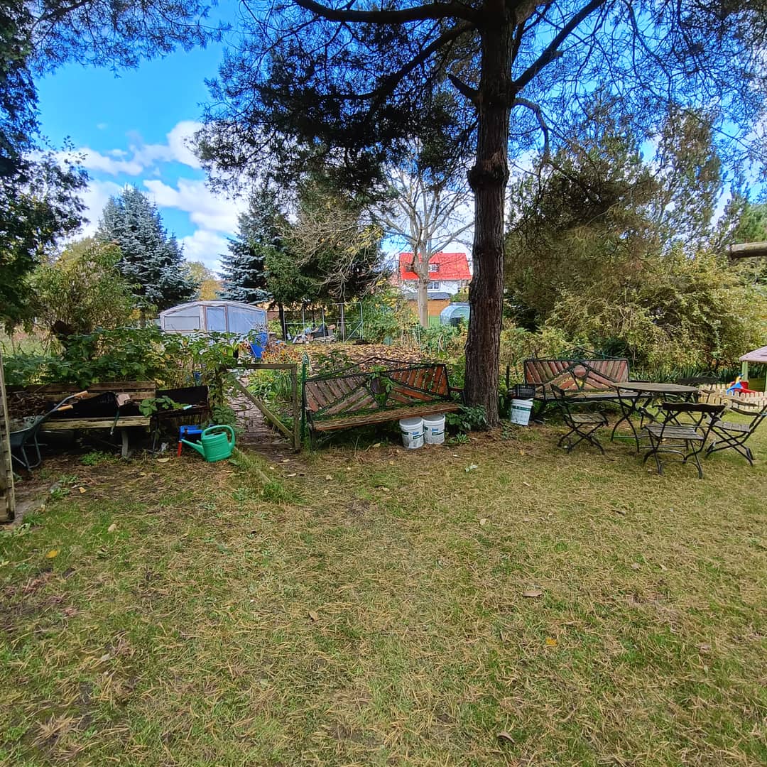 ogród z częścią zieloną, warzywniakiem i tunelem foliowym.