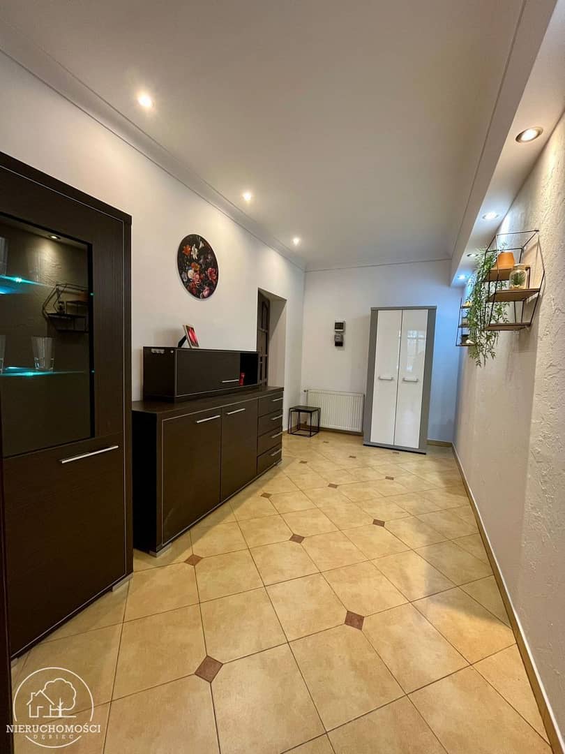 Na podłogach panele oraz kafle, okna nowe drewniane. Lokal bardzo słoneczny, jasny i przestronny.