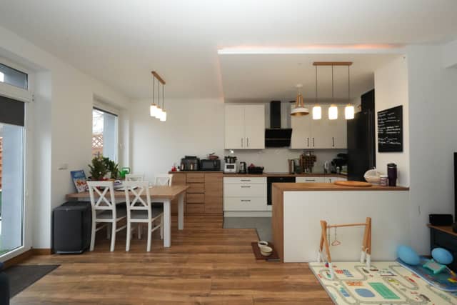 przestronny salon z aneksem kuchennym z wyjściem na taras o pow. 30m2.