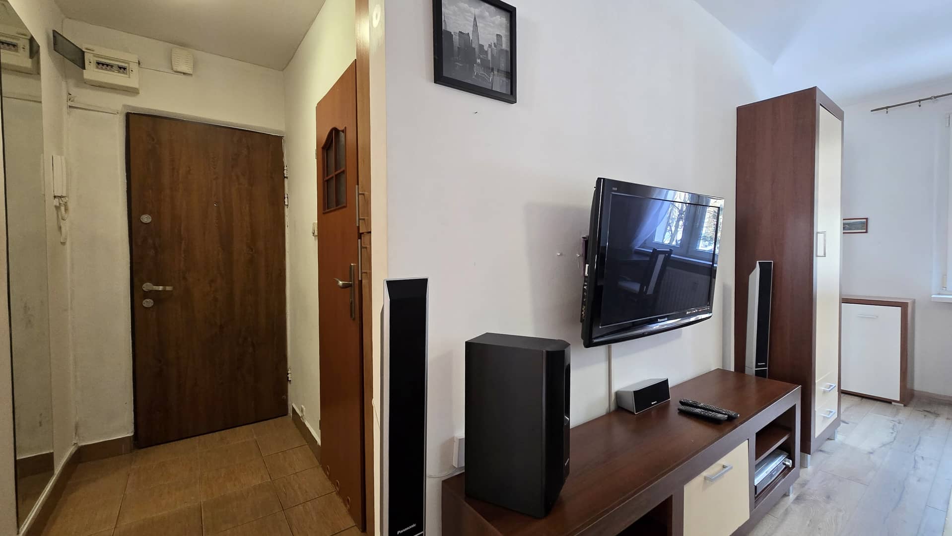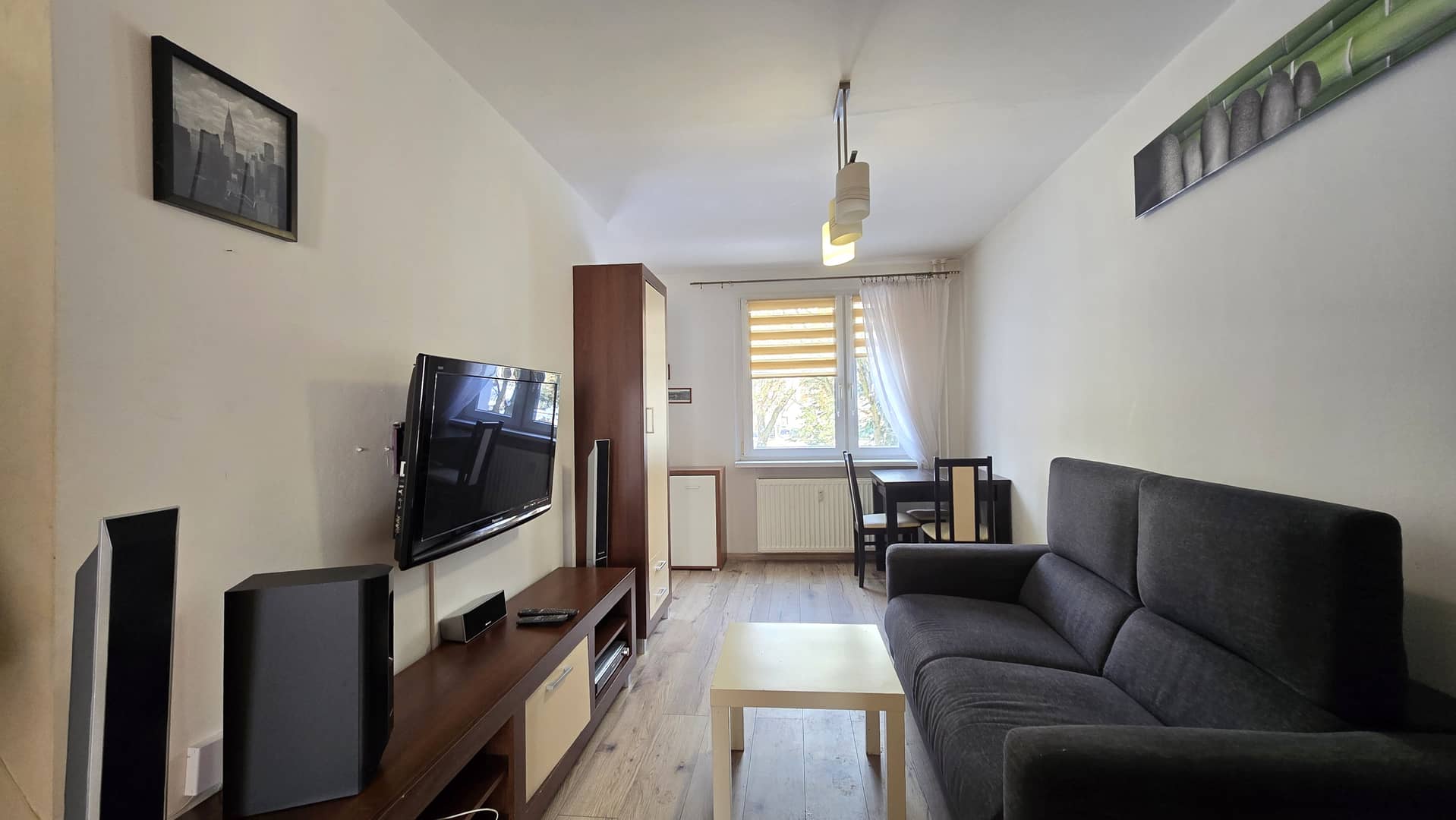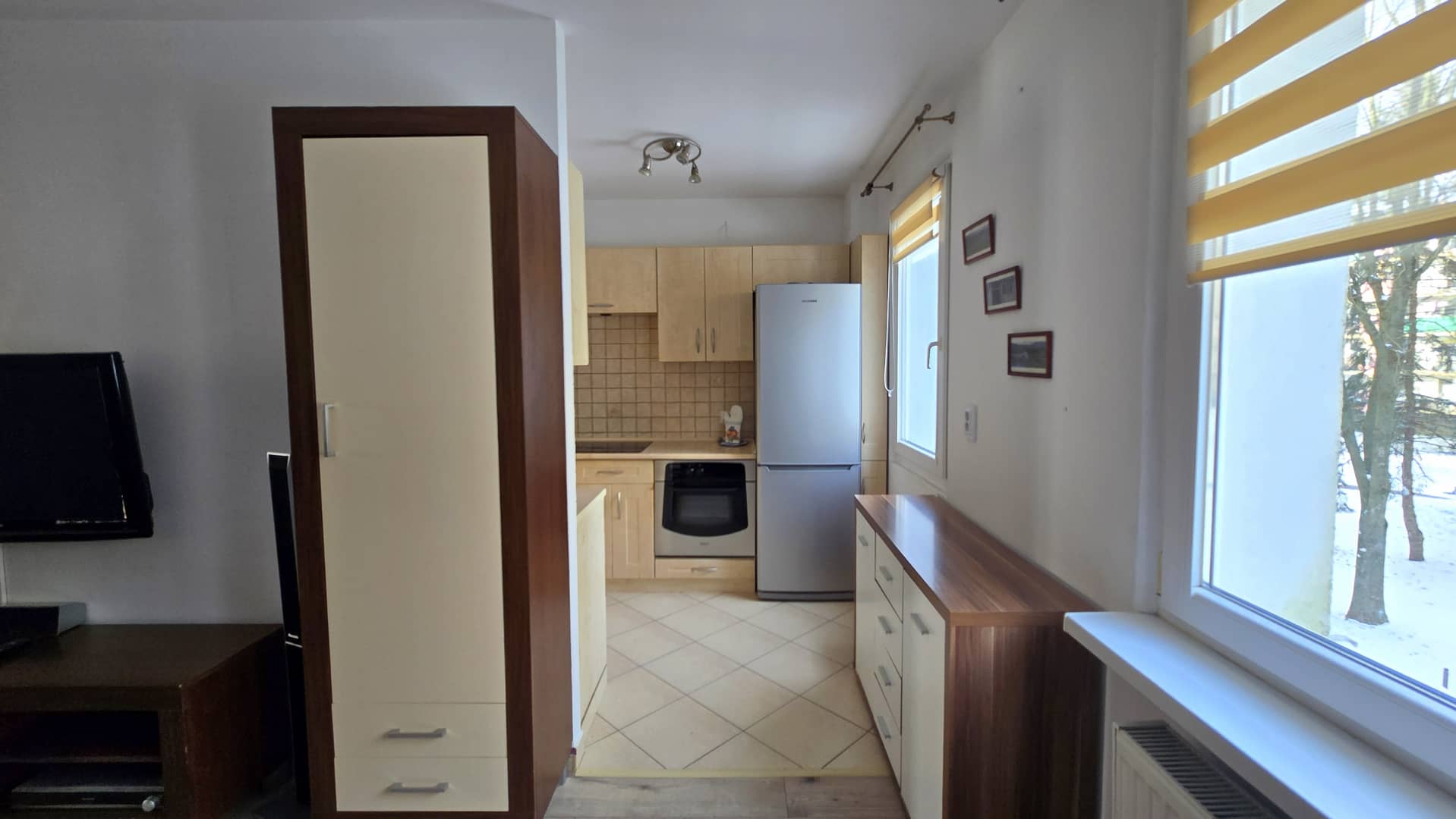 Mieszkanie: duży salon z aneksem kuchennym, duży przedpokój, łazienka, Na wyposażeniu szafa, komoda, narożnik z funkcją spania, fotel jednoosobowy do spania, komoda, meble kuchenne, zmywarka, k