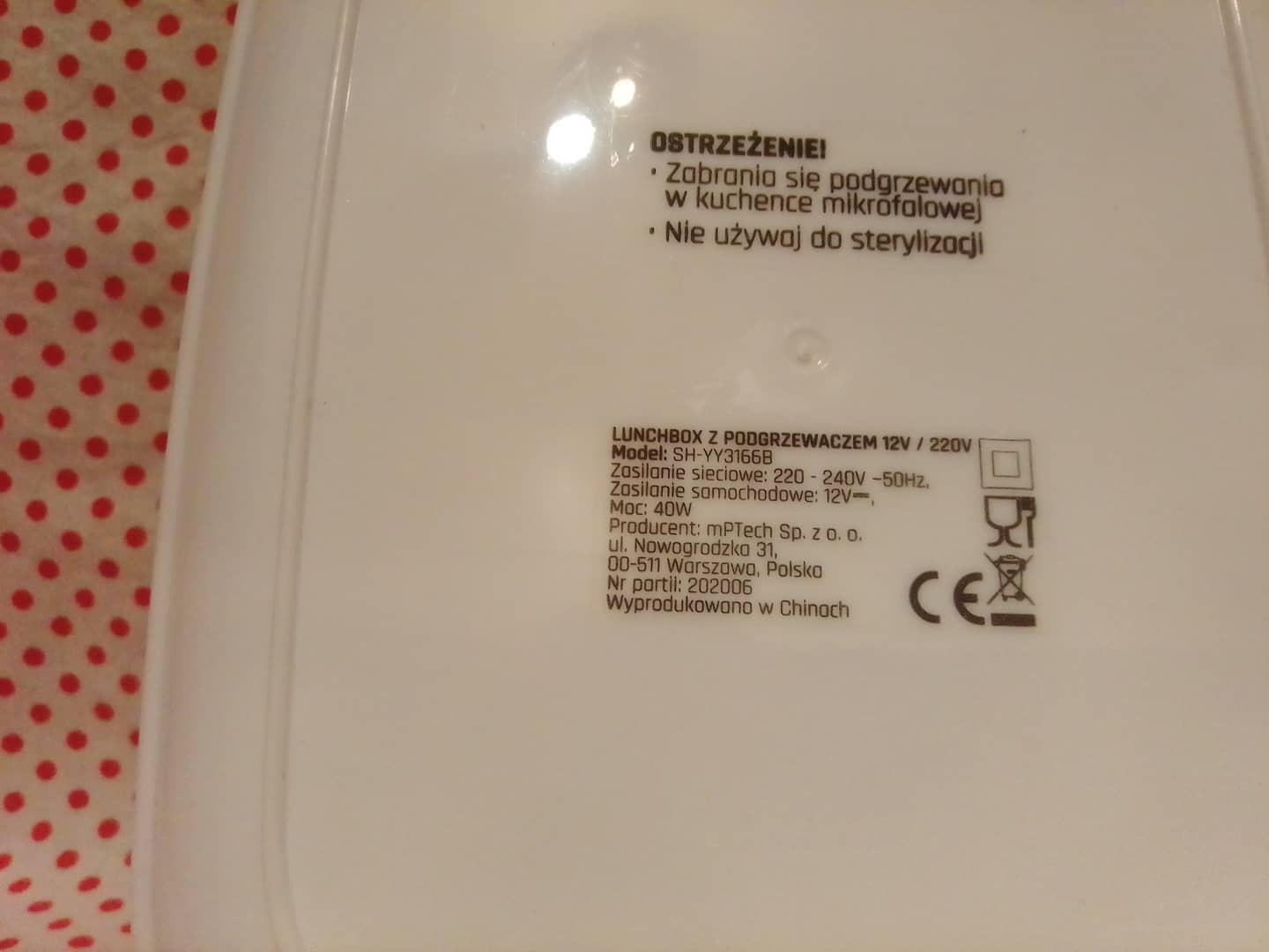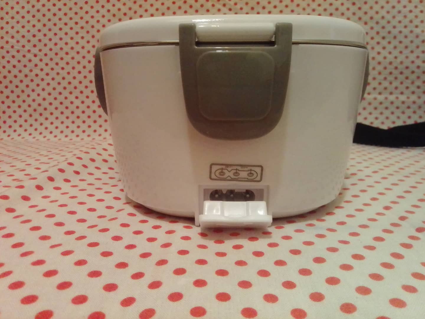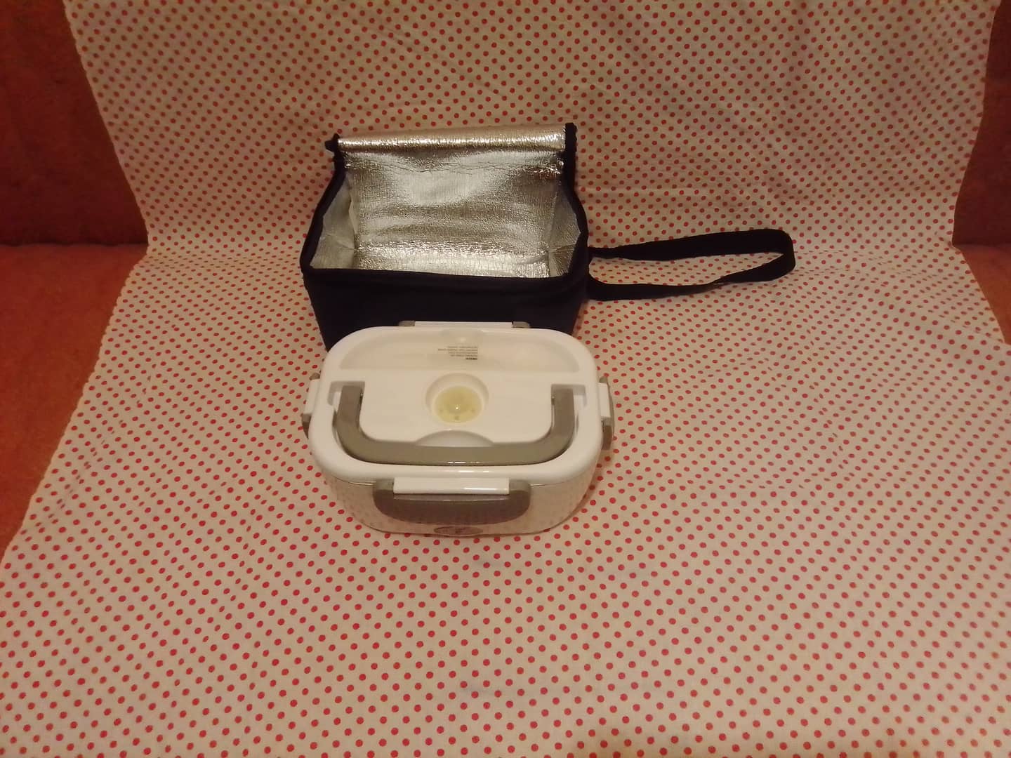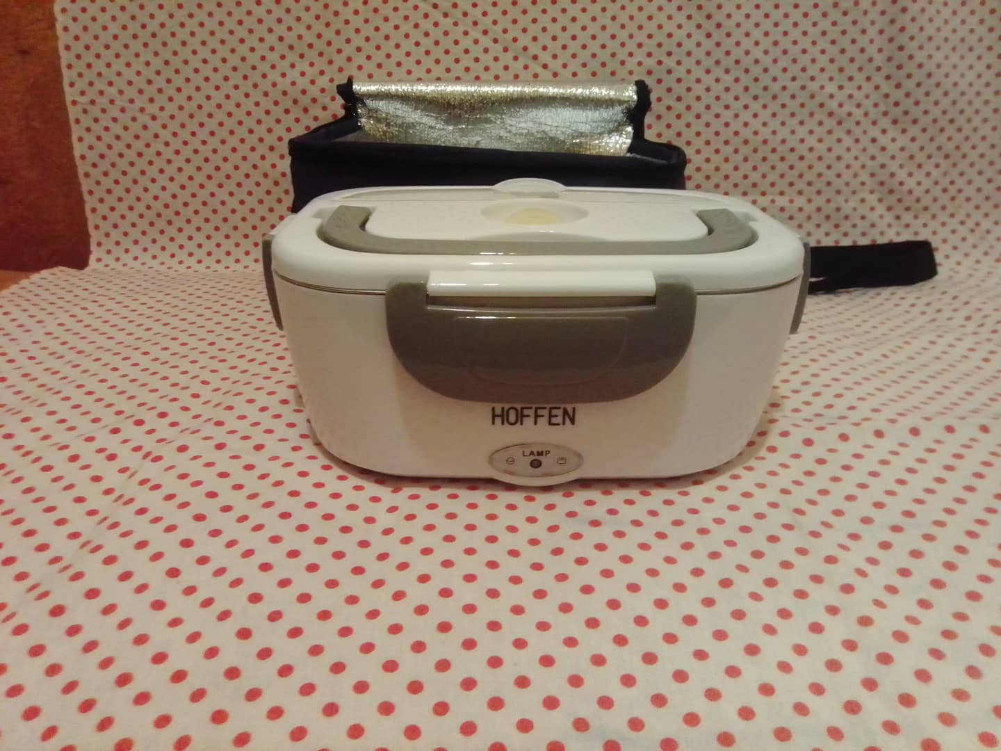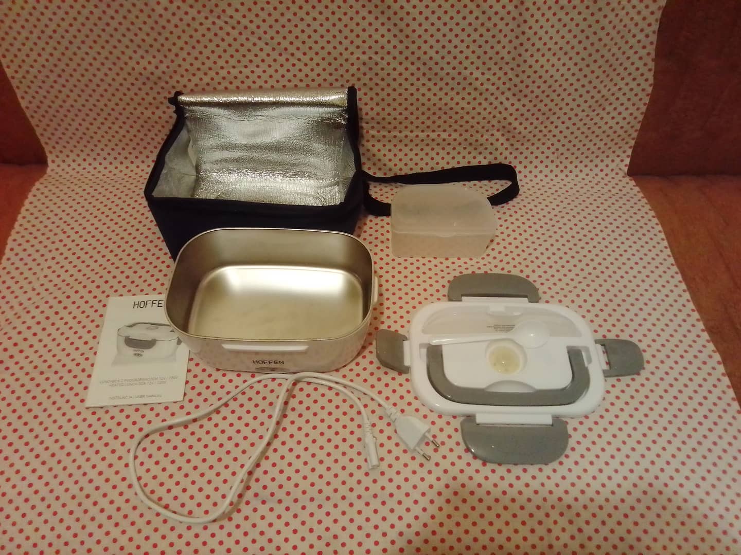Lunchbox Hoffen (elektryczny podgrzewacz do żywności). Do użytku w domu, w pracy itp. Moc 40W. Napięcie 220 - 240V/12V. Wizualnie jak nowy, bez oznak użytkowania. Technicznie sprawny. W komplecie z podgrzewaczem torba izotermiczna, łyżeczka, plastikowy pojemnik, instrukcja obsługi w języku polskim, kabel zasilający. Brak przewodu zasilającego do samochodu.15 zł.
