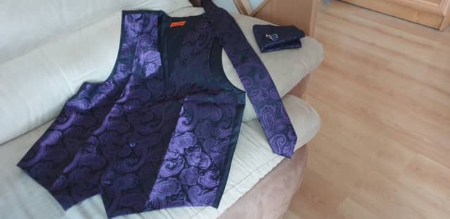 Super elegancki męski komplet- kamizelka, krawat, poszetka i spinki do mankietów, rozm M, czarna z błyszczącym fioletowym wzorem. Kupiłem za duży rozmiar. Nowe nieużywane. Cena 50 zł.
