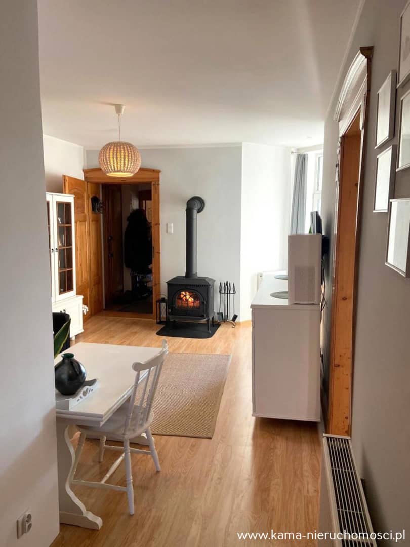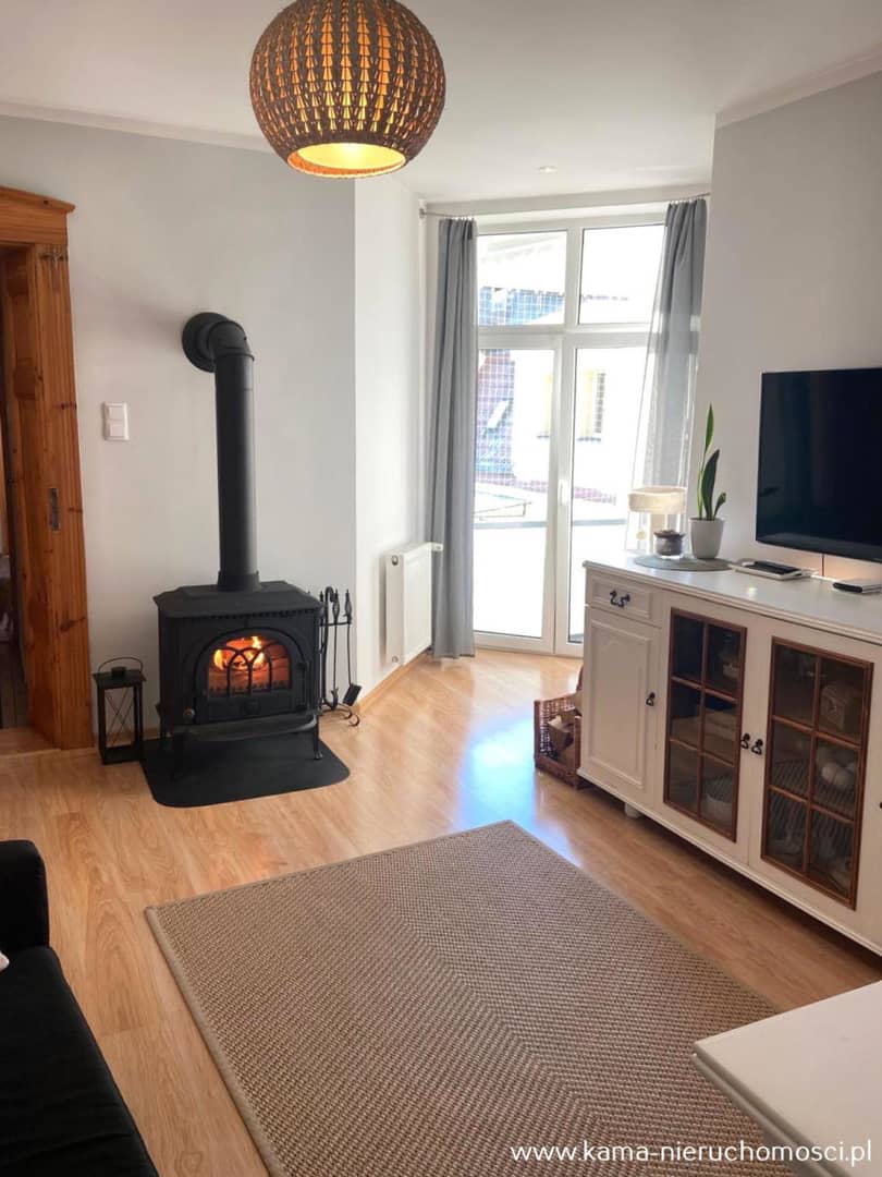 Dodatkowo w salonie znajduje się kominek.