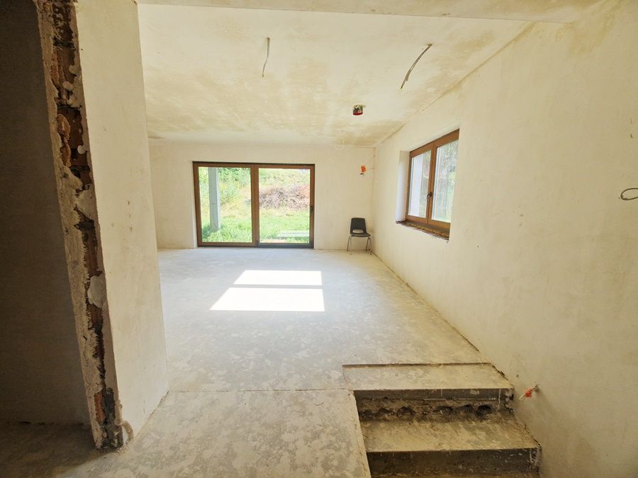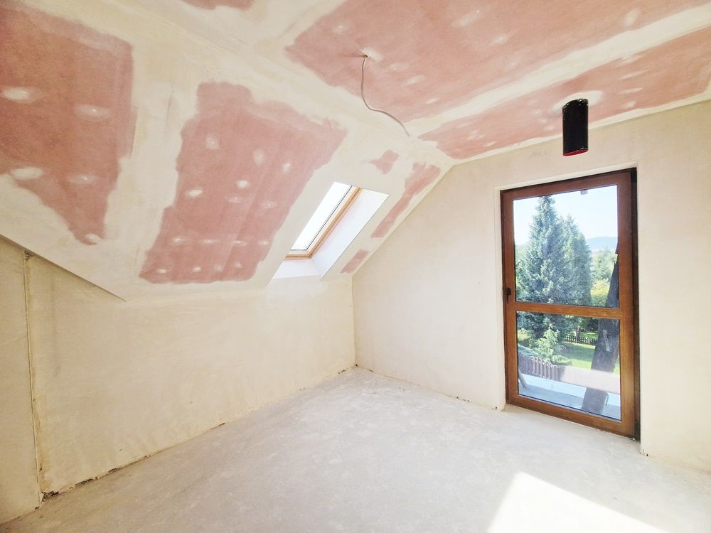 Okna PCV, dach pokryty dachówką karpiówką. Budynek wybudowany z Porotermu, Silki, Ytongu, stropy Terriva.