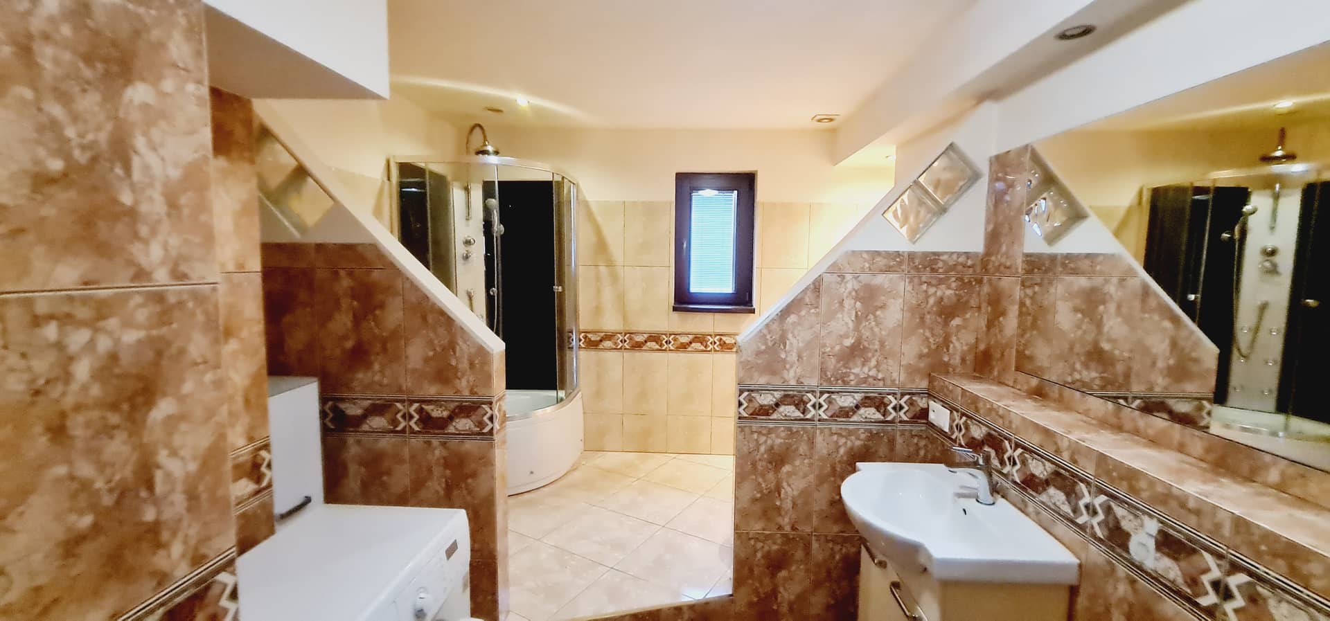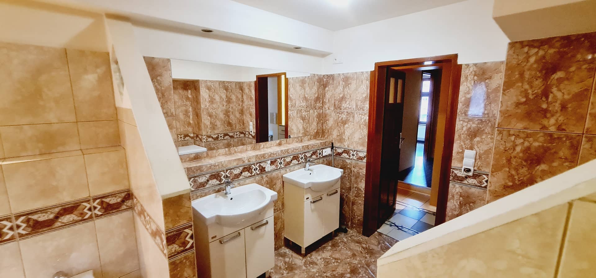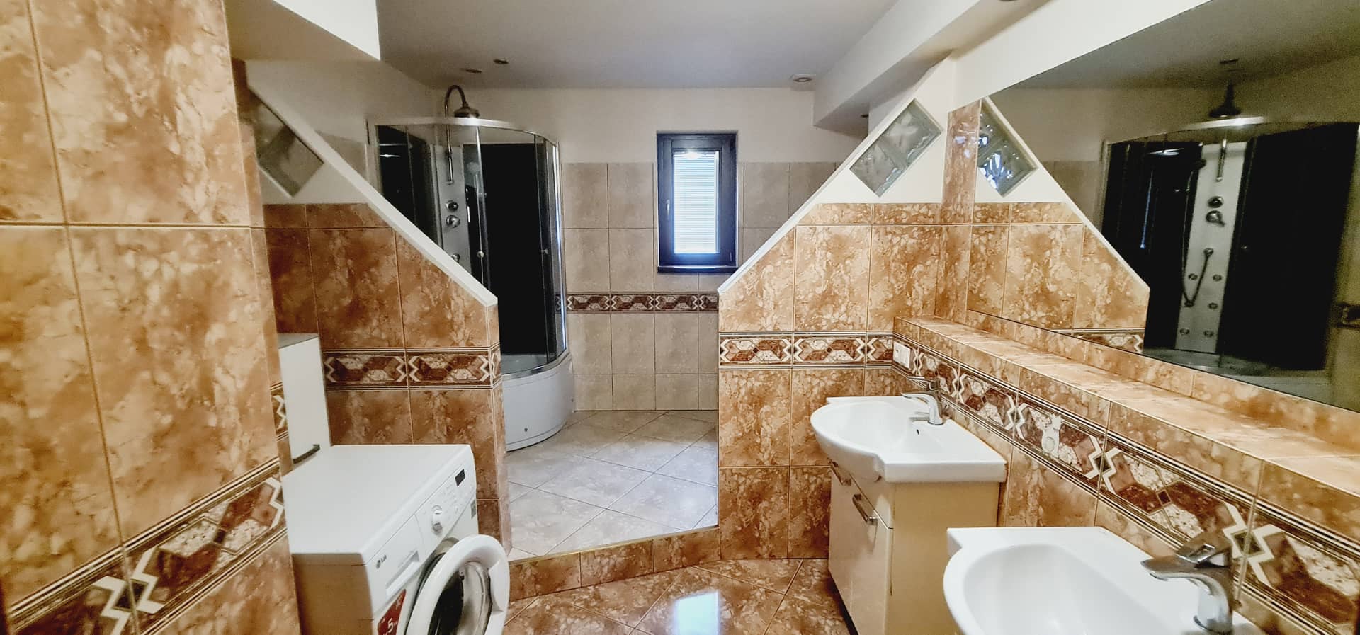 Duża łazienka zapewnia wygodę codziennego użytkowania znajduje się w niej kabina prysznicowa, dwie umywalki oraz bidet.