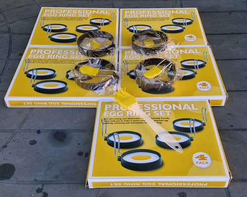 Foremka do smażonych jajek, 4 sztuki. Nieprzywierające okrągłe ze szczotką I odporną na oparzenie silikonową obudową- jajka, kanapki, angielskie babeczki. Cena 35zł