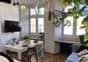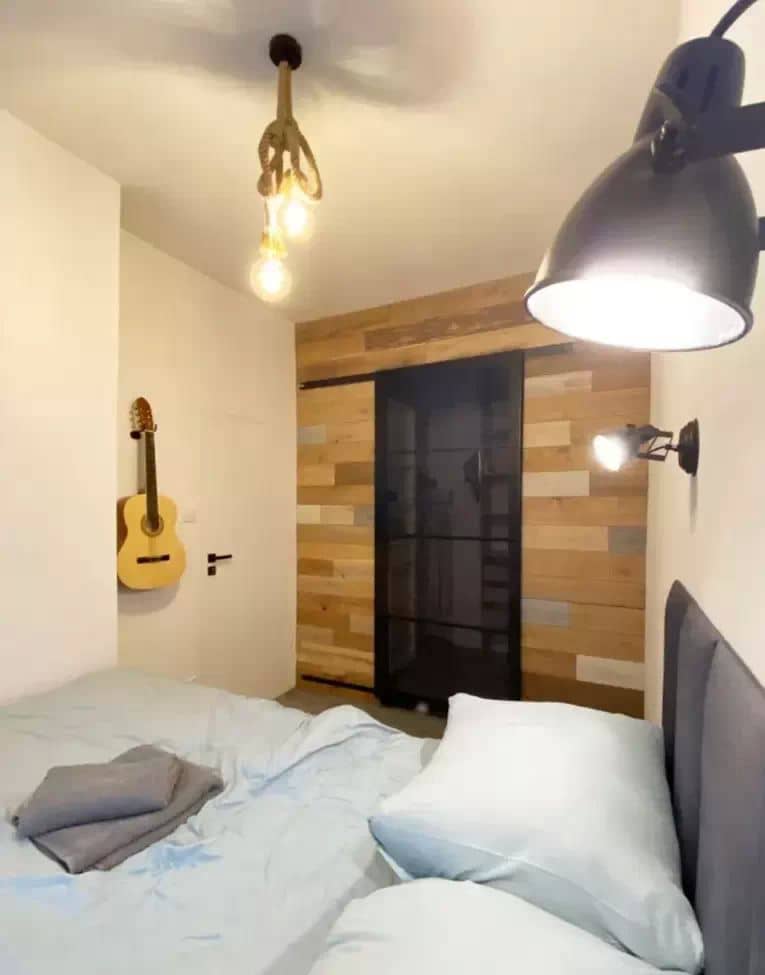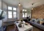 Wnętrze urządzone w spójnym stylu loftowo-skandynawskim, z wykorzystaniem naturalnych materiałów cegły i drewna.