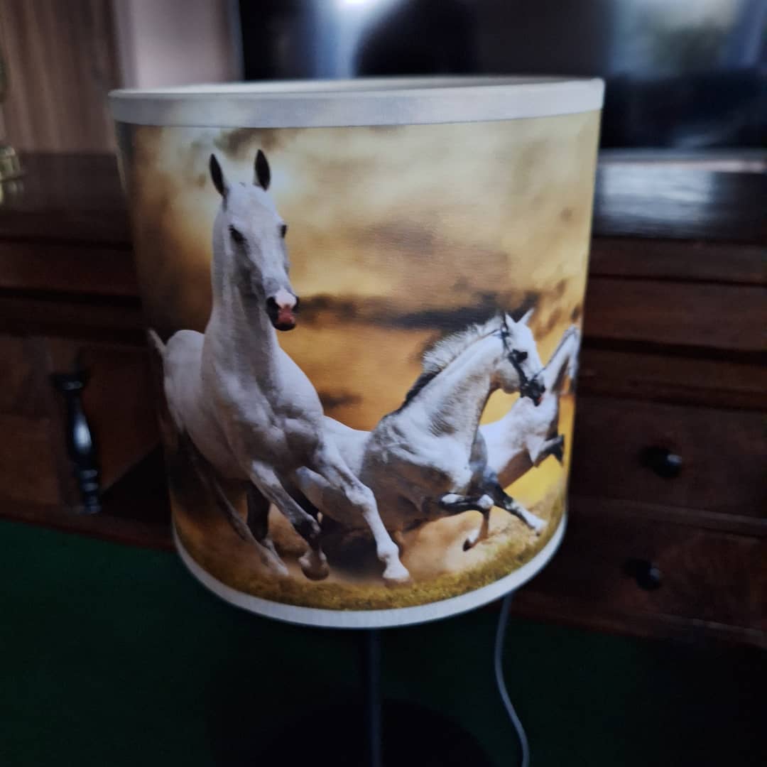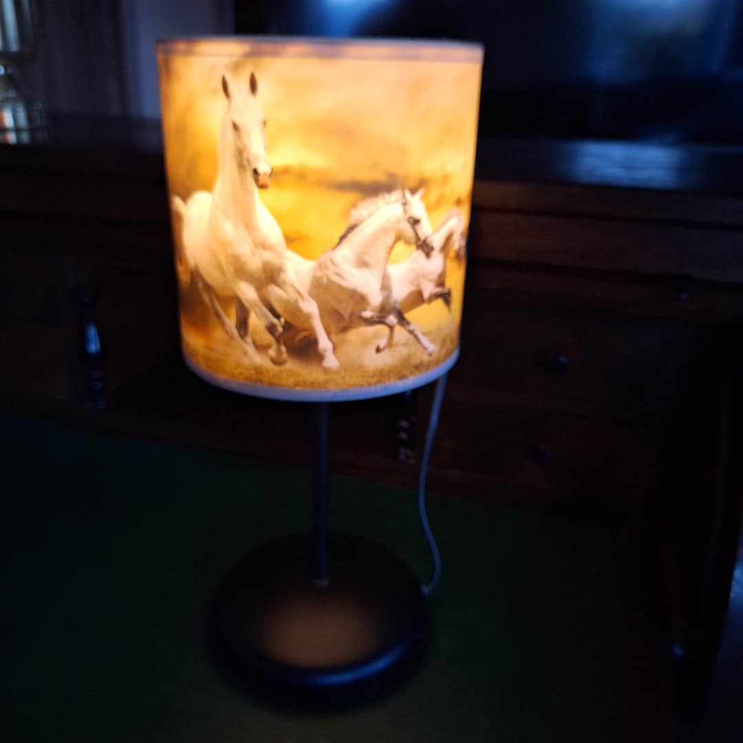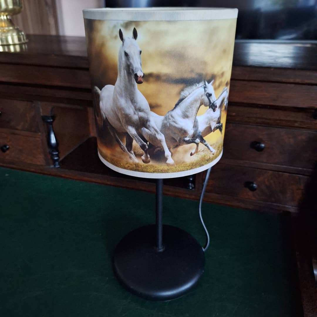 Piękna lampka nocna ,abażurek to konie w galopie, elektryczna i energetyczna.Podstawa metalowa, w komplecie z żarówką, wysokość 35 cm. Możliwy dowóz lub wysyłka. Cena 48 zł.