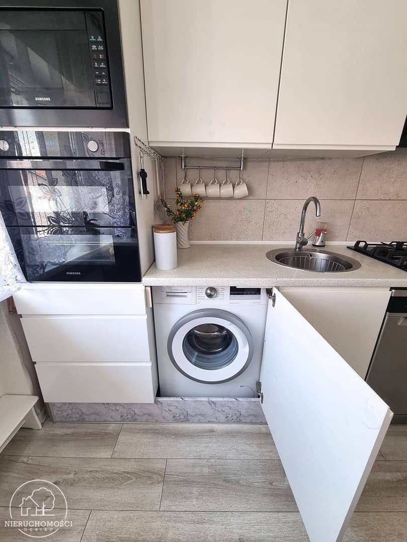 Zabudowa kuchenna wyposażona w kuchenkę gazową, piekarnik, zmywarkę, oraz kuchenkę mikrofalową.