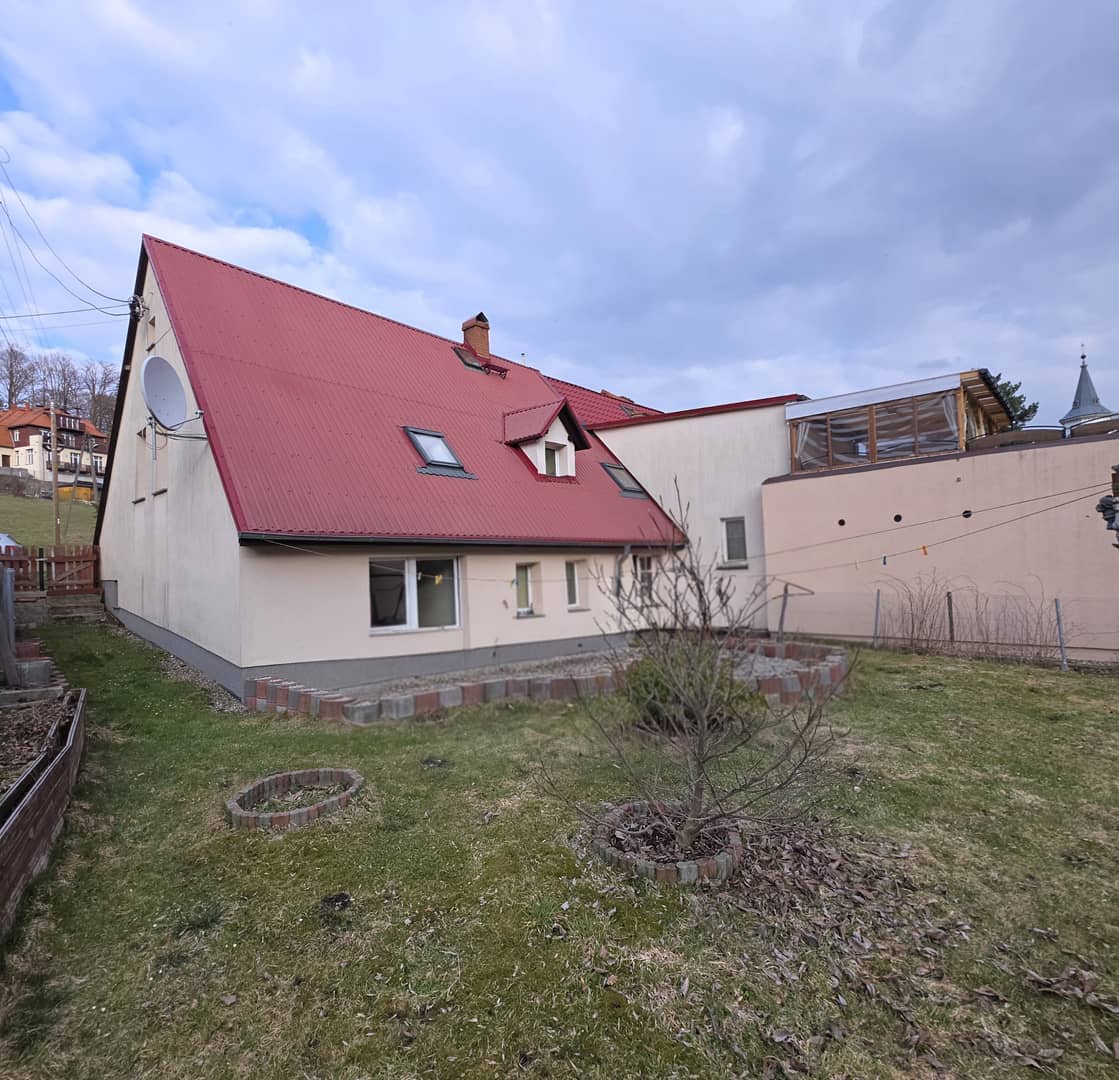 Połowa domu w podziale pionowym w Szklarskiej Porębie Dolnej. Usytuowana w spokojnej części miasta, w budynku po remoncie, gdzie została wykonana elewacja wraz z ociepleniem, izolacja oraz ocieplony i wymieniony dach, pokryty blacho dachówką. Posadowiony na dzialce o powierzchni całkowitej 1344m2, w udzialavh 50% nalezacych do zbywanej nieruchomosvi i umownie wydzielonych z sasiadem. Powierzchnia całkowita wynosi 106,45 m2. Obejmuje kotłownię, korytarz, miejsce wydzielone na łazienkę, kuchnie, sypialnie oraz salon z wyjsciem na taras i ogród. W tej części rozpoczety remont kapitalny, nowe tynki, posadzki, instalacje elektryczna, wodno-kanalizacyjna oraz grzewcza, do wykończenia według własnych potrzeb, stanowić może odrębne mieszkanie. Na piętro prowadzą drewniane schody gdzie znajduje się kuchnia, sypialnia z garderobą, pokój dzienny oraz łazienka. Powyżej strych. Okna pcv, podłogi na piętrze drewniane wyłożone wykladziną pcv, ściany odnowione, wymieniona cześć instalacji elektrycznej. Ogrzewanie gazowe, piec dwufinkcyjny. Teren ogrodzony, na stronę frontową zakupione już nowe przesła do obsadzenia. Ogród zagospodarowany, również do przystosowania i upodobania według własnego gustu. Atrakcyjna lokalizacja z uwagi na położenie z dostepem do przystanku w bliskiej odległości jak również sklepu spożywczego. Do ścisłego centrum Szklarskiej Poręby 6 km. W okolicy liczne szlaki turystyczne i stoki narciarskie. Oferta w bardzo dobrej cenie 450 000 zł do negocjacji, dostępna tylko w Naszym biurze Nieruchomości Rychlewski. Serdecznie zapraszam na prezentację.