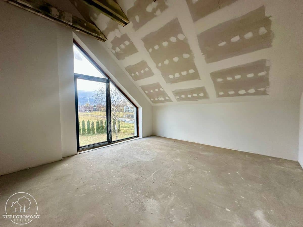 Jasne wnętrze z otwartą przestrzenią nad salonem, duże przeszklenia i widok na góry to duże atuty tej nieruchomości.