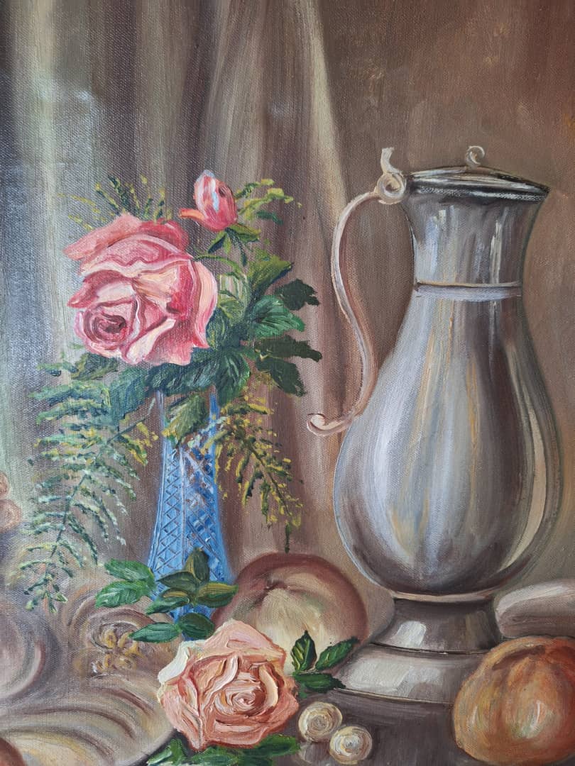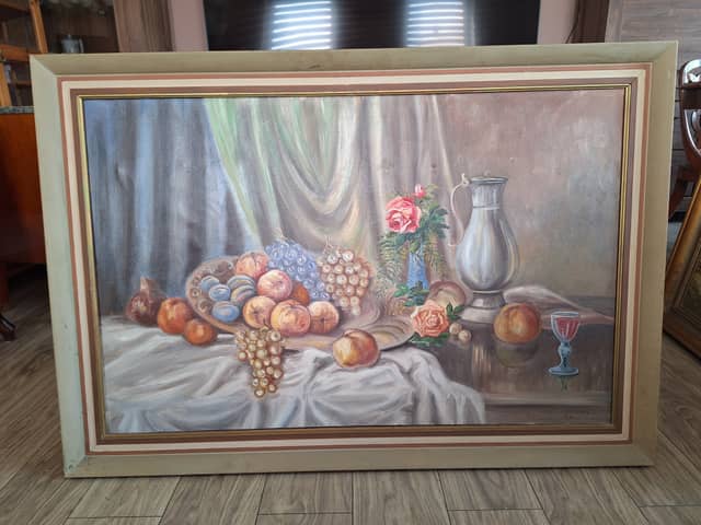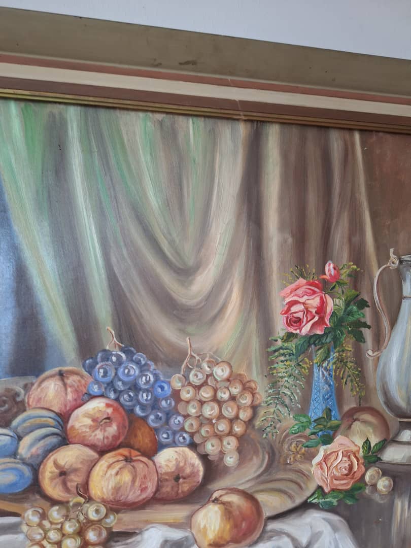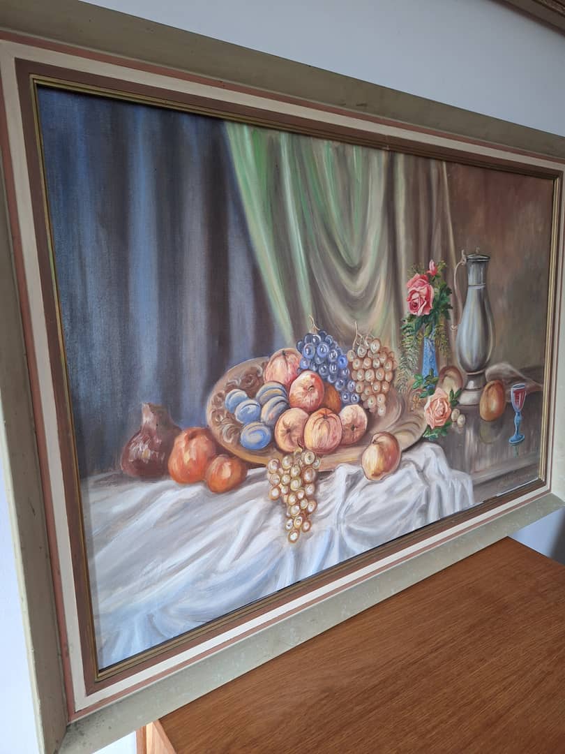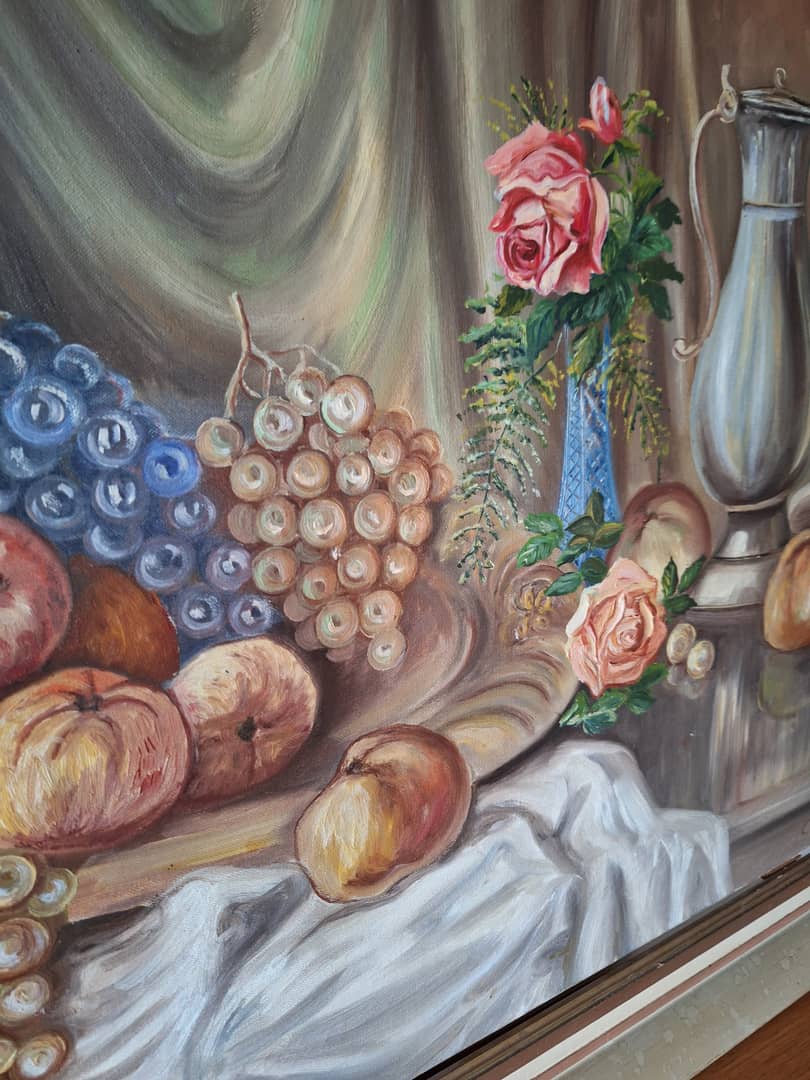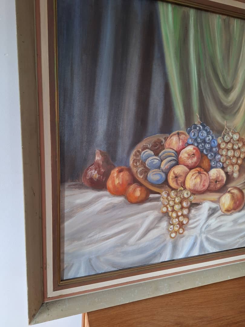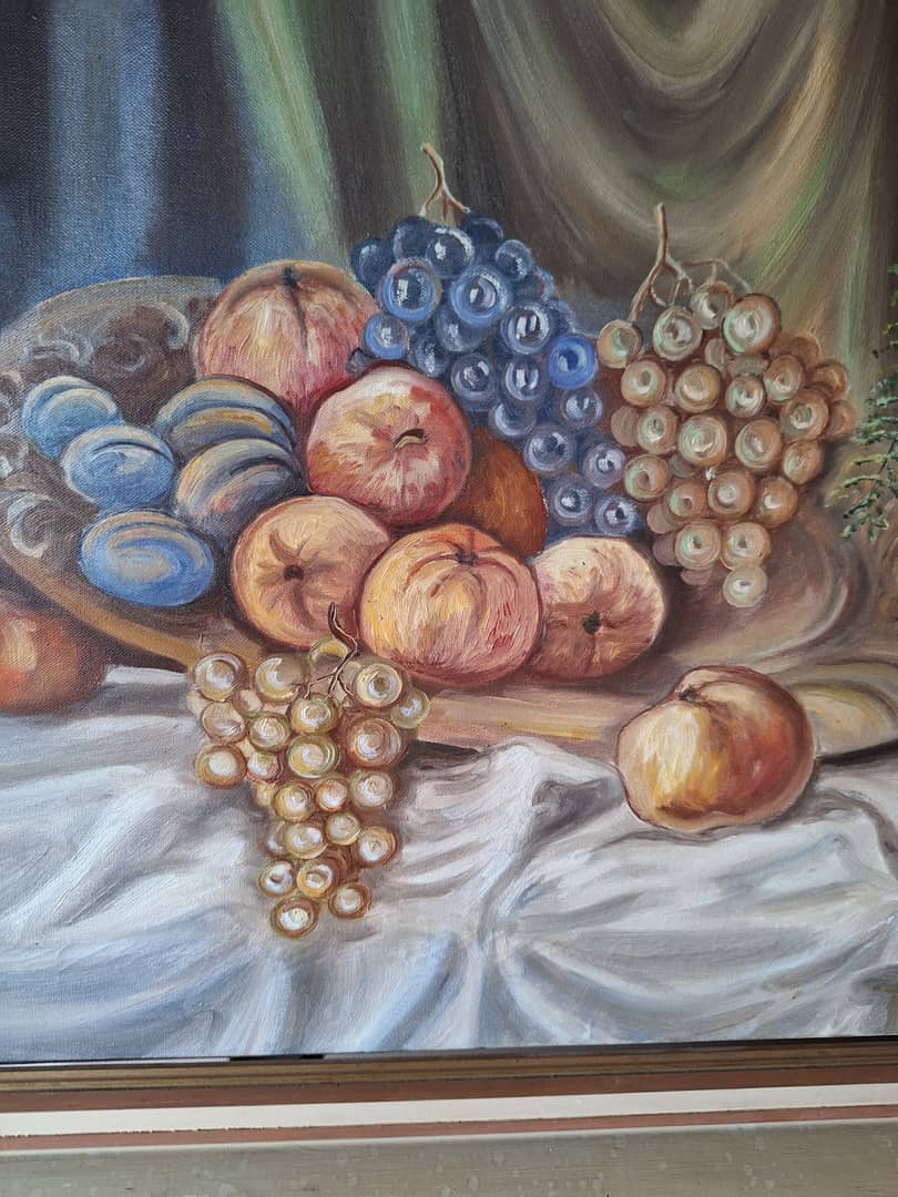 Piękny, duży obraz malowany na płótnie, przedstawiający owoce na paterze . Cudna kolorystyka, wielkość 112/77 cm. Możliwy dowóz. Cena 150 zł.