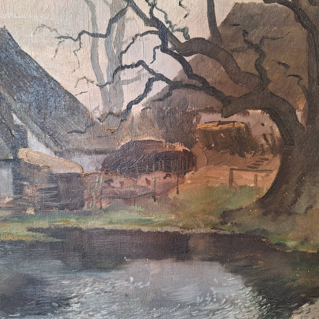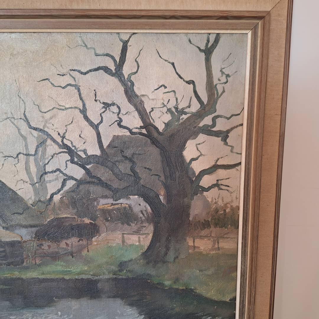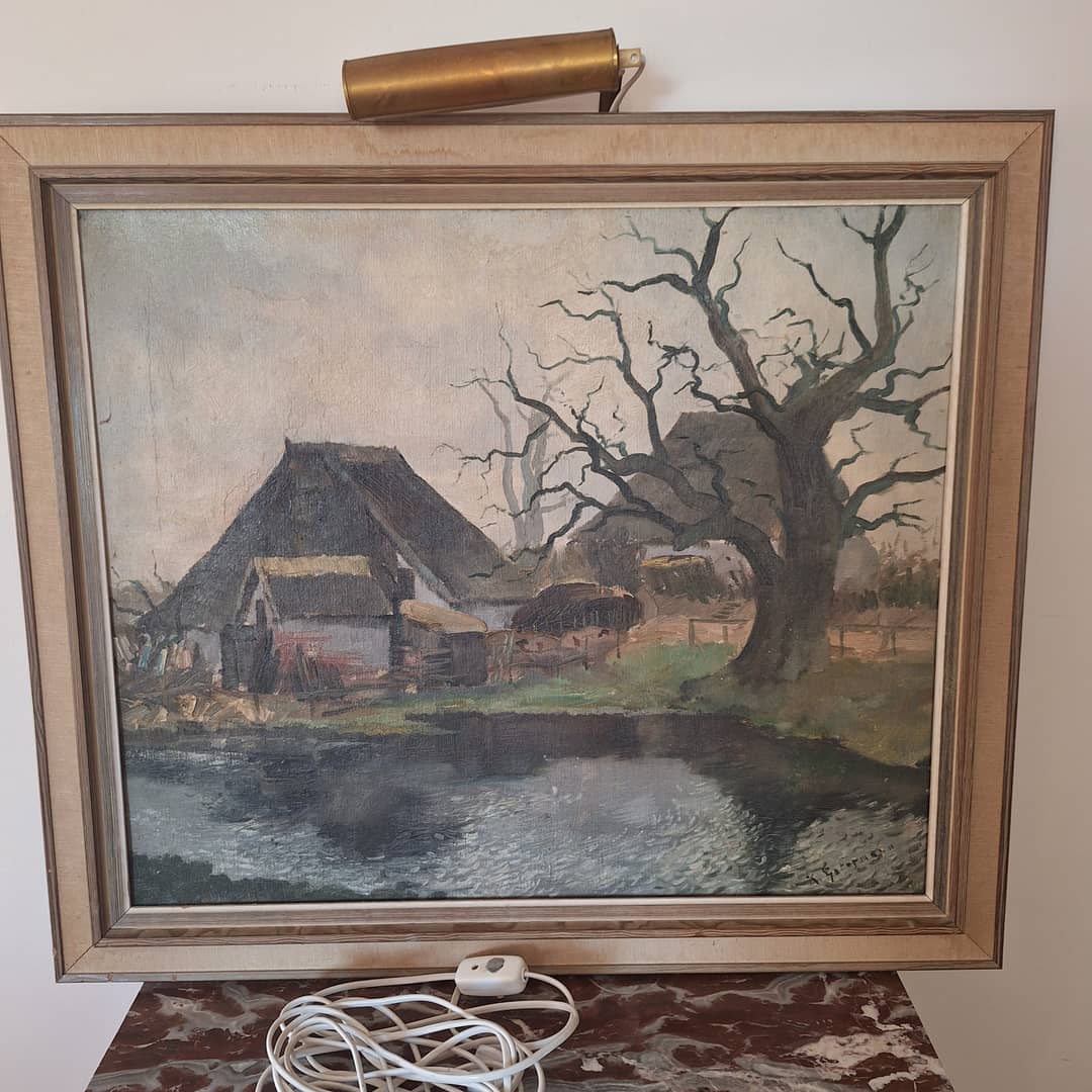 Obraz olejny malowany na płótnie, wiejski pejzaż, dom kryty strzechą, podświetlany. Wielkość 78/68 cm. Możliwy dowóz lub wysyłka. Cena 80 zł.