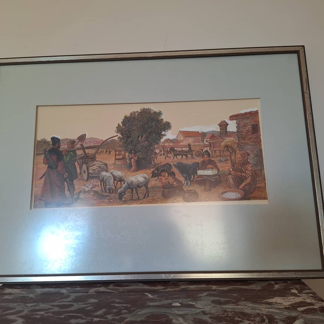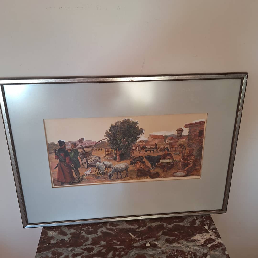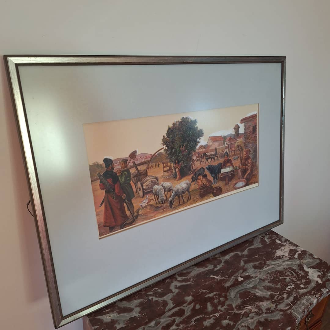 Obrazek scena rodzajowa z życia wiejskiego lub historycznego, postacie są tradycyjnych strojach. Wielkość 76/53 cm. Możliwy dowóz, cena 70 zł.