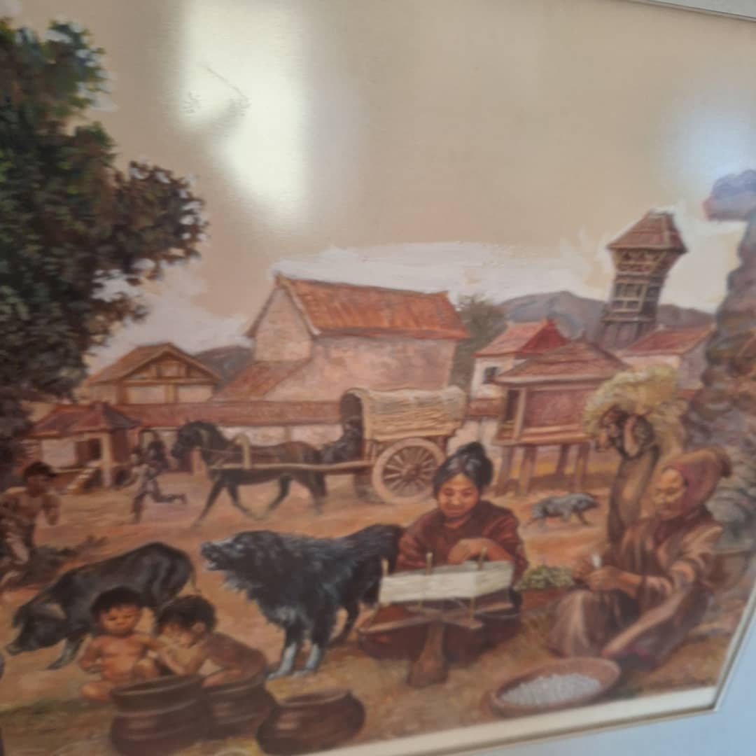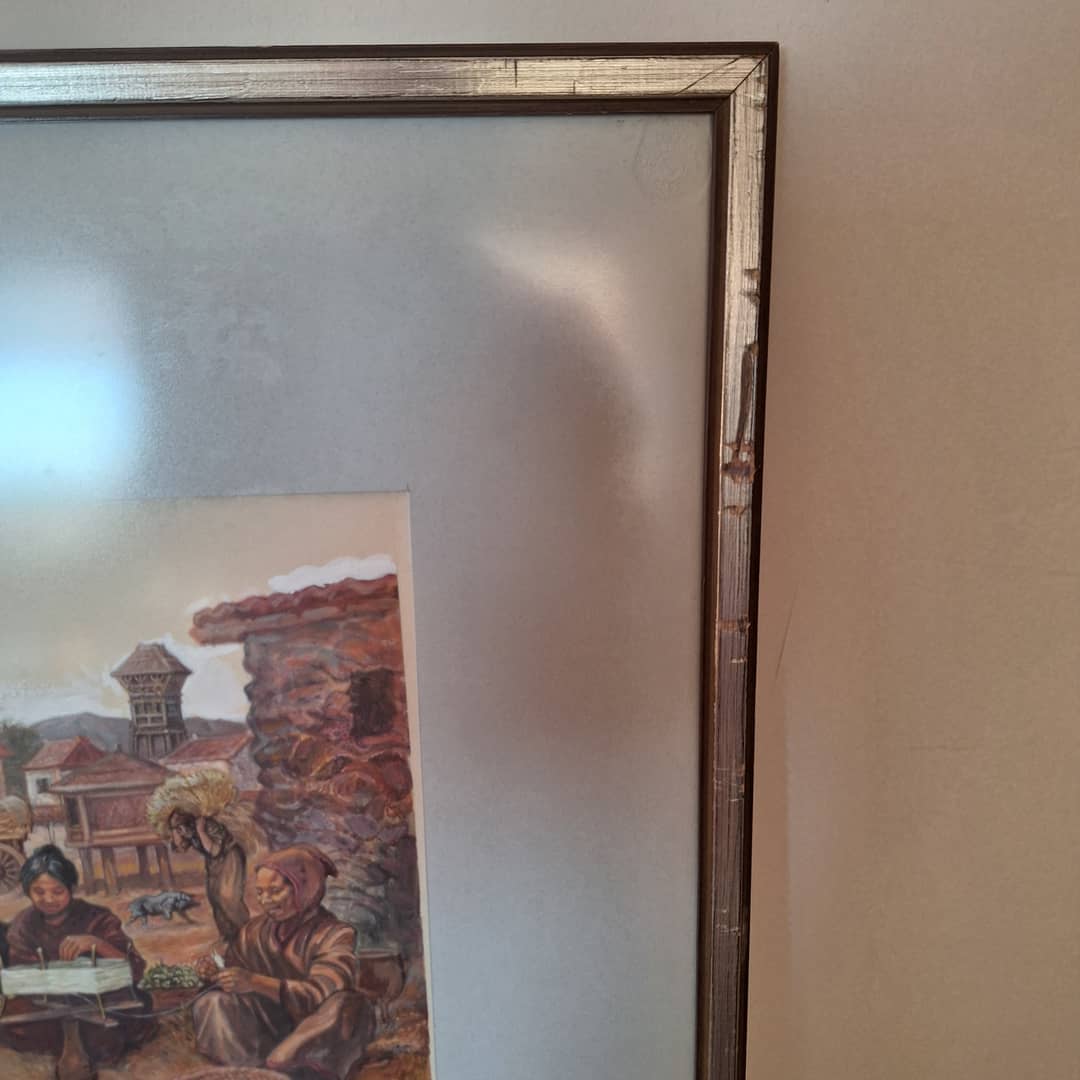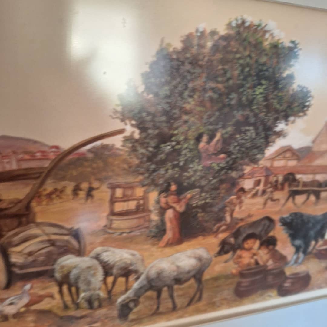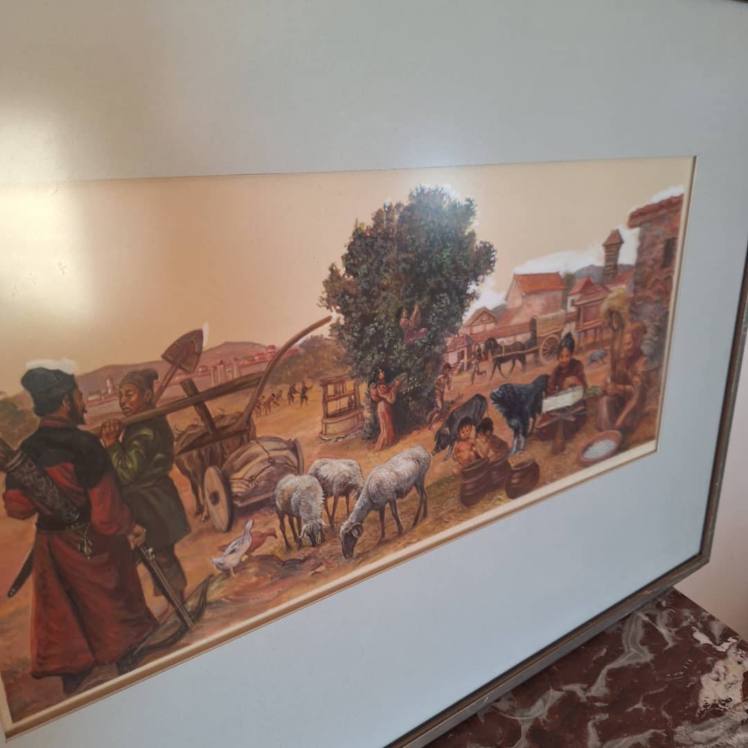 Obrazek scena rodzajowa z życia wiejskiego lub historycznego, postacie są tradycyjnych strojach. Wielkość 76/53 cm. Możliwy dowóz, cena 70 zł.