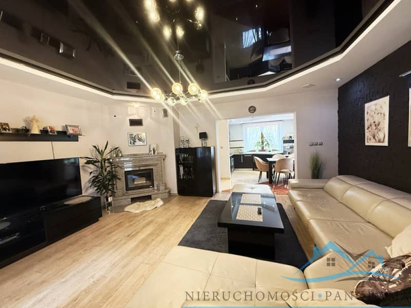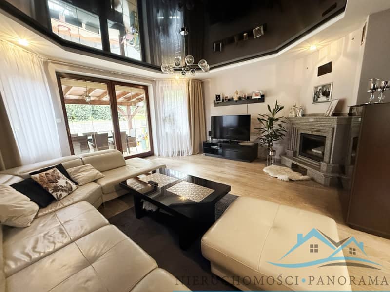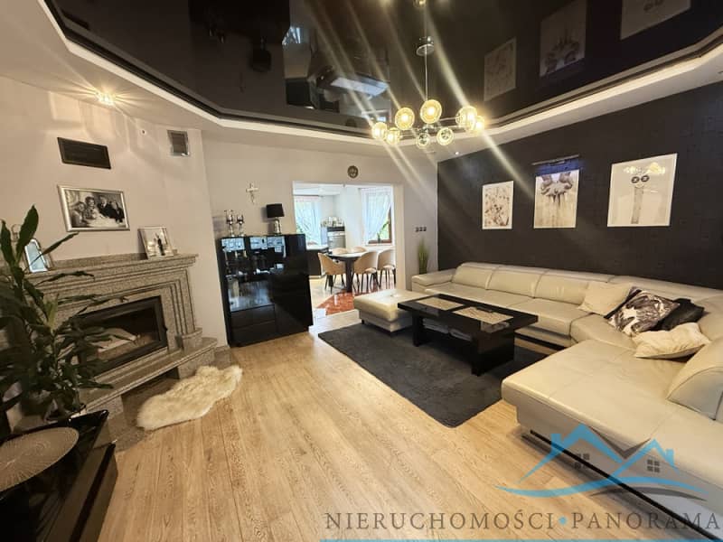 – przestronny salon z kominkiem i wyjściem na taras połączony z kuchnią i jadalnią;