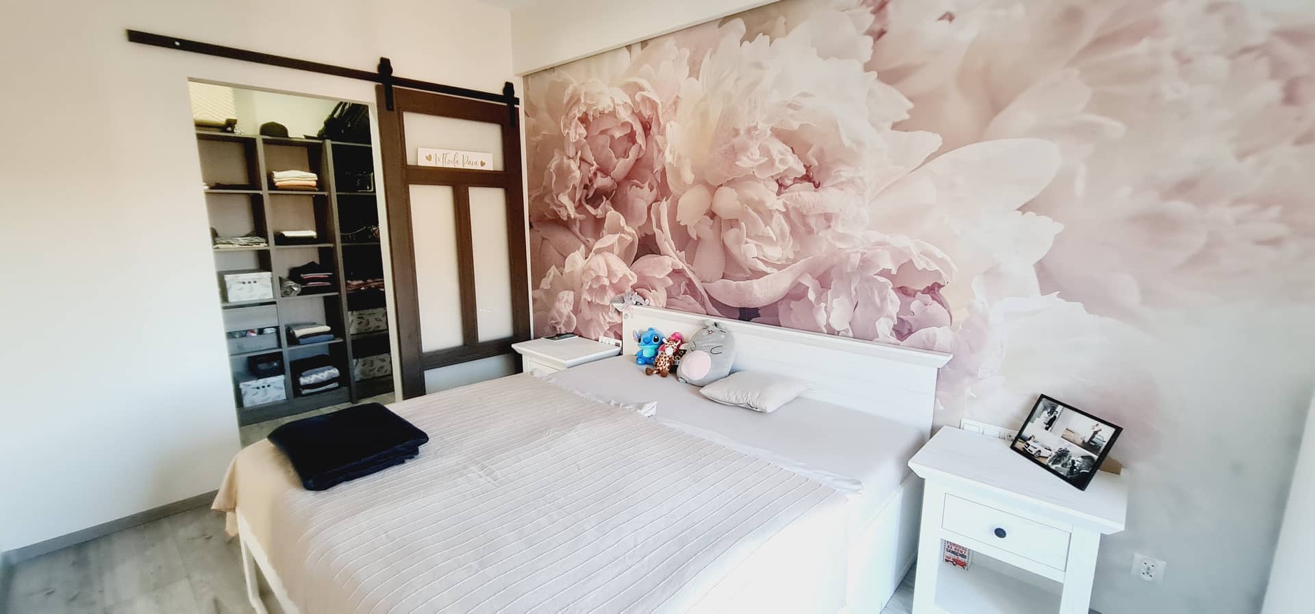 W mieszkaniu znajduje się sypialnia z garderobą, a drzwi do niej są przesuwne, co nadaje wnętrzu nowoczesnego charakteru i pozwala lepiej wykorzystać przestrzeń. Kuchnia została zaprojektowana w funkcjonalny sposób i wyposażona w stylową wyspę, która stanowi zarówno miejsce do przygotowywania posiłków, jak i spotkań przy wspólnym stole. Na wyposażeniu pozostaje większa część mebli i sprzętu AGD.