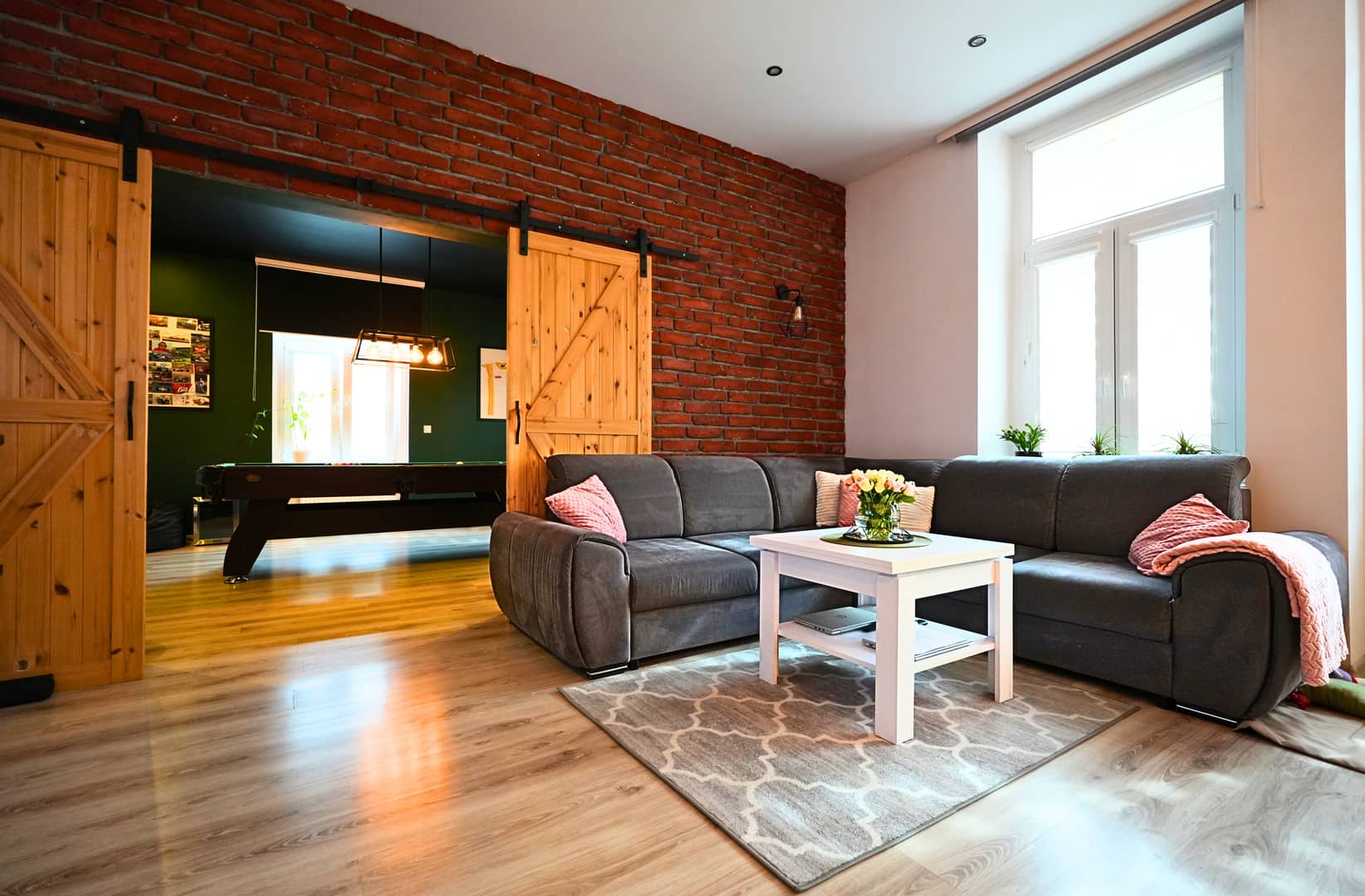 - Przestronnego salonu z ceglaną ścianą i nowoczesnym oświetleniem – idealne miejsce do wypoczynku, z salonu wyjście na balkon o pow. 10 m2.