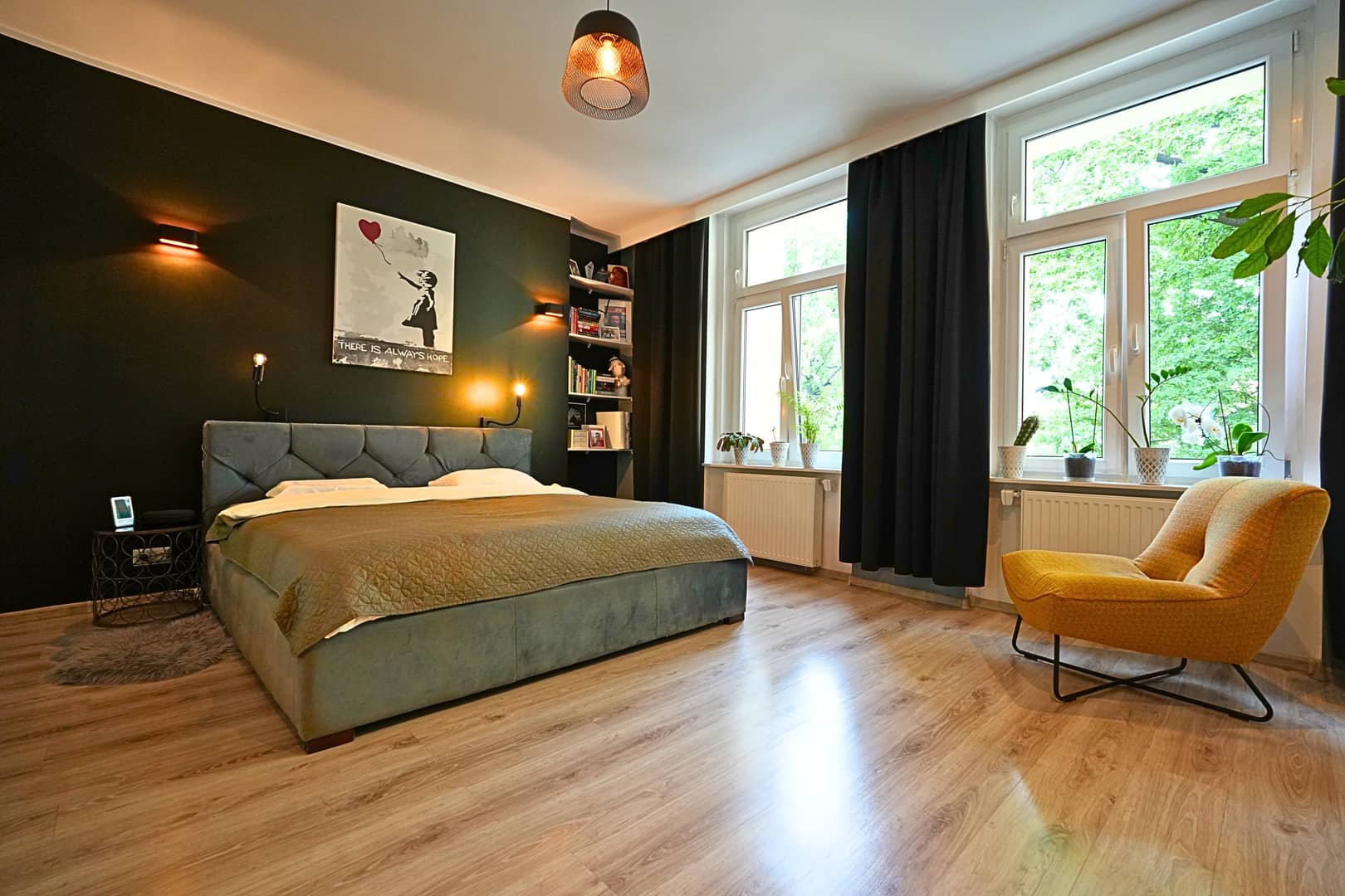 - Sypialni nr I- stylowa przestrzeń w eleganckich, ciemnoszarych odcieniach, która zapewnia poczucie spokoju i intymności. Pomieszczenie wyposażone zostało w pojemną