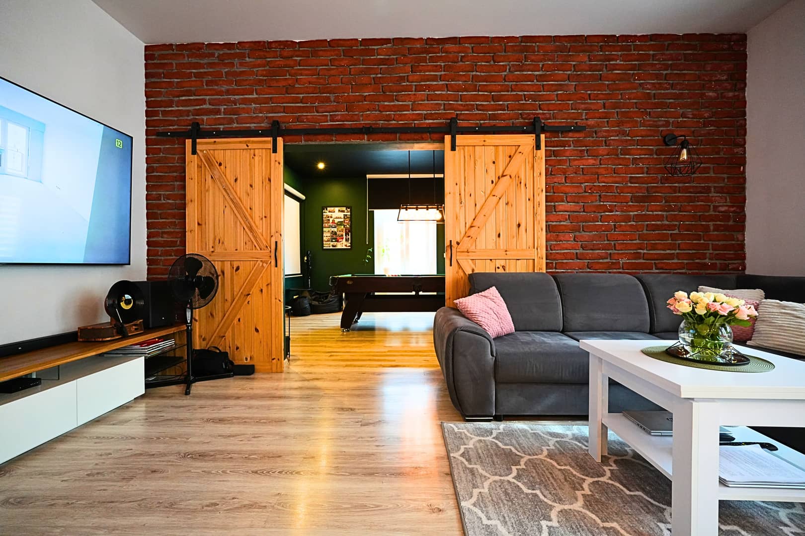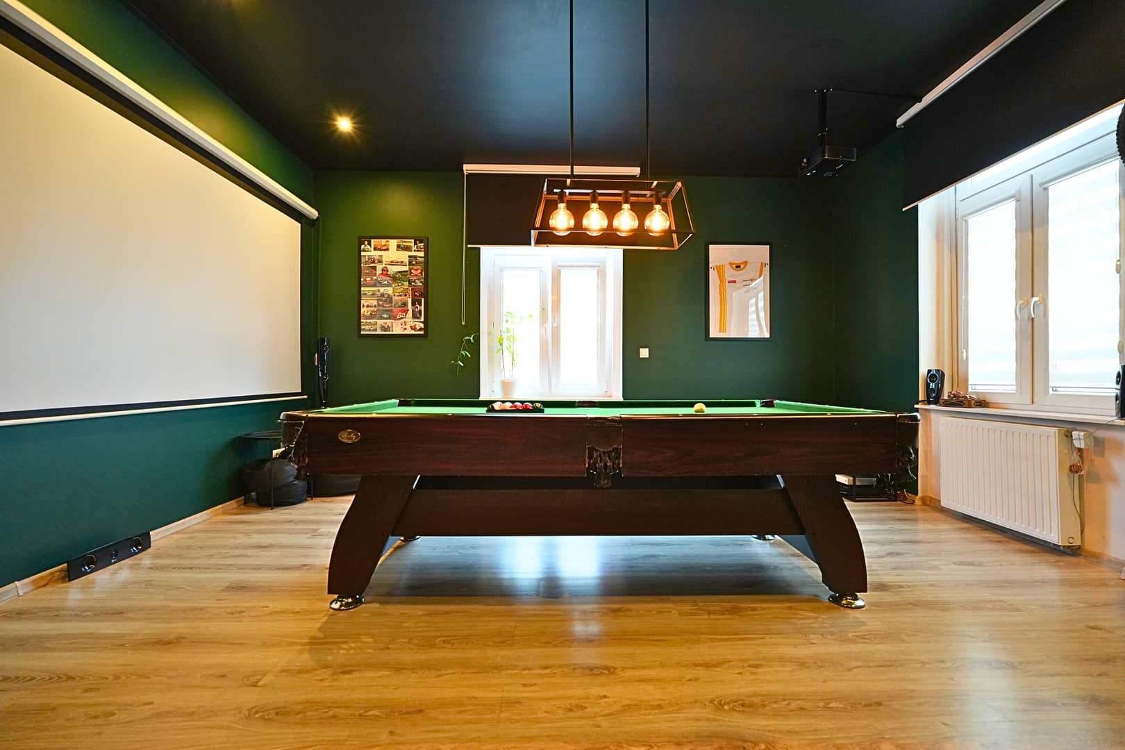 - Pokoju - obecnie wykorzystywany jako strefa rozrywkowa, w pomieszczeniu znajduje się stół bilardowy wraz ze strefą kina domowego.