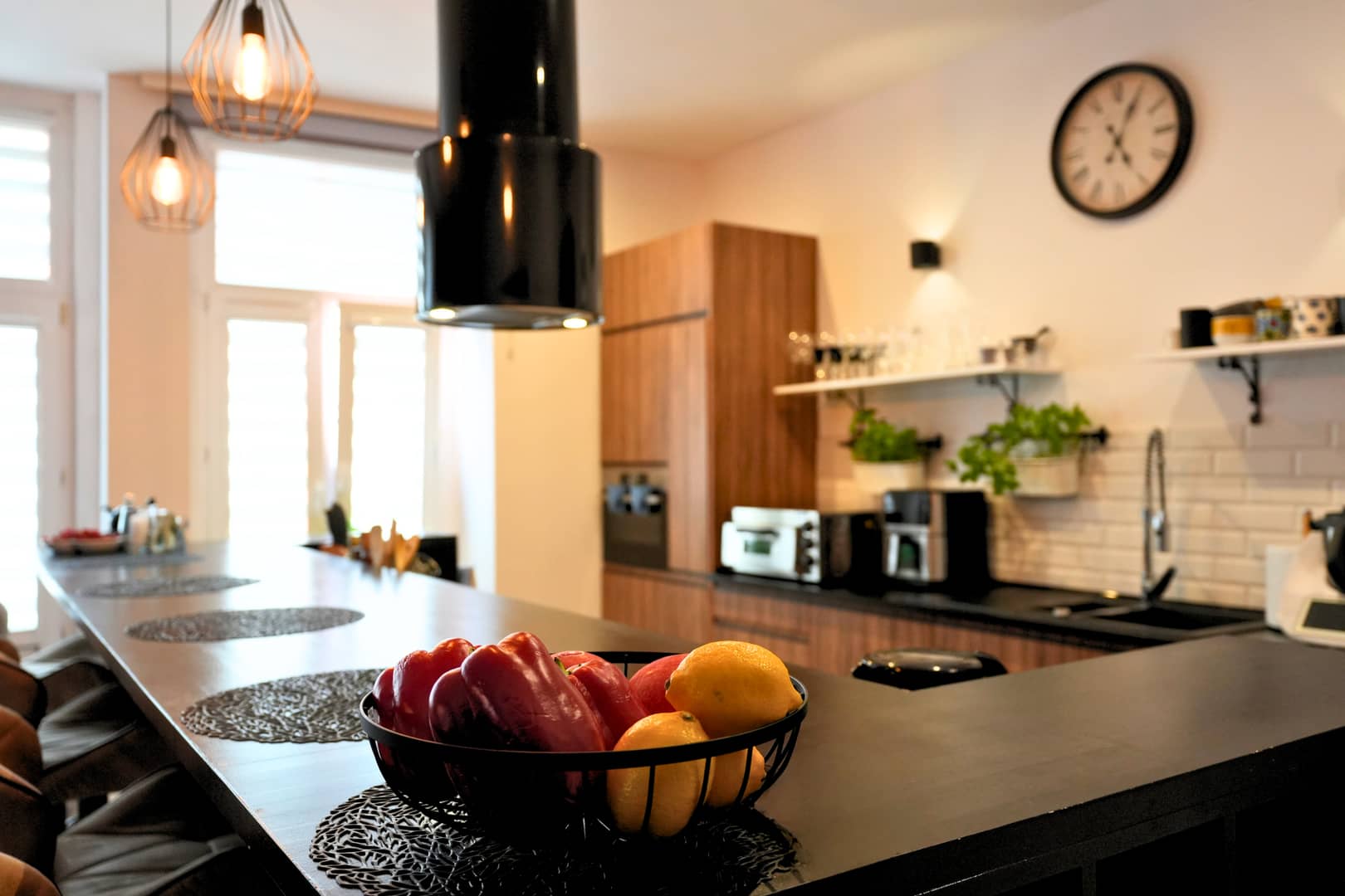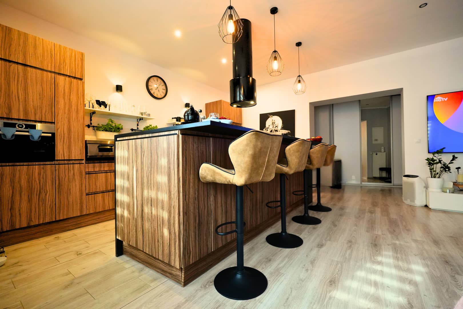 - Nowoczesnej kuchni połączonej z salonem z wyspą kuchenną, wyposażoną w wysokiej klasy zabudowę oraz sprzęty AGD, która z pewnością zadowoli najbardziej