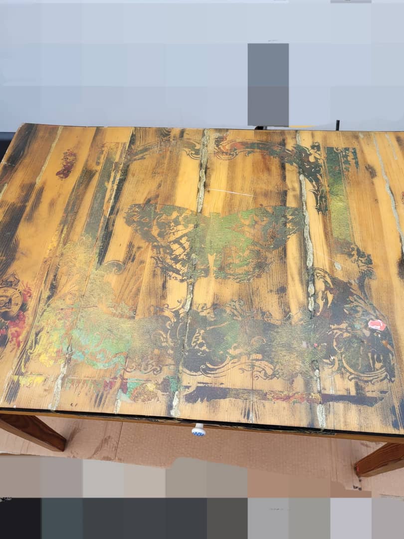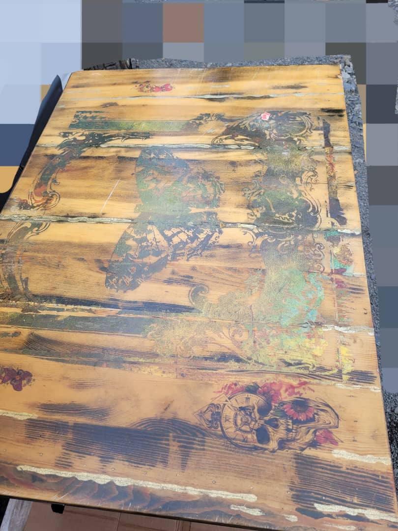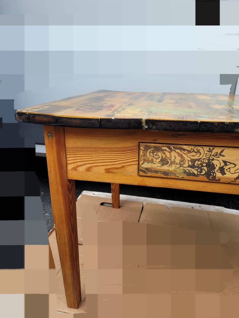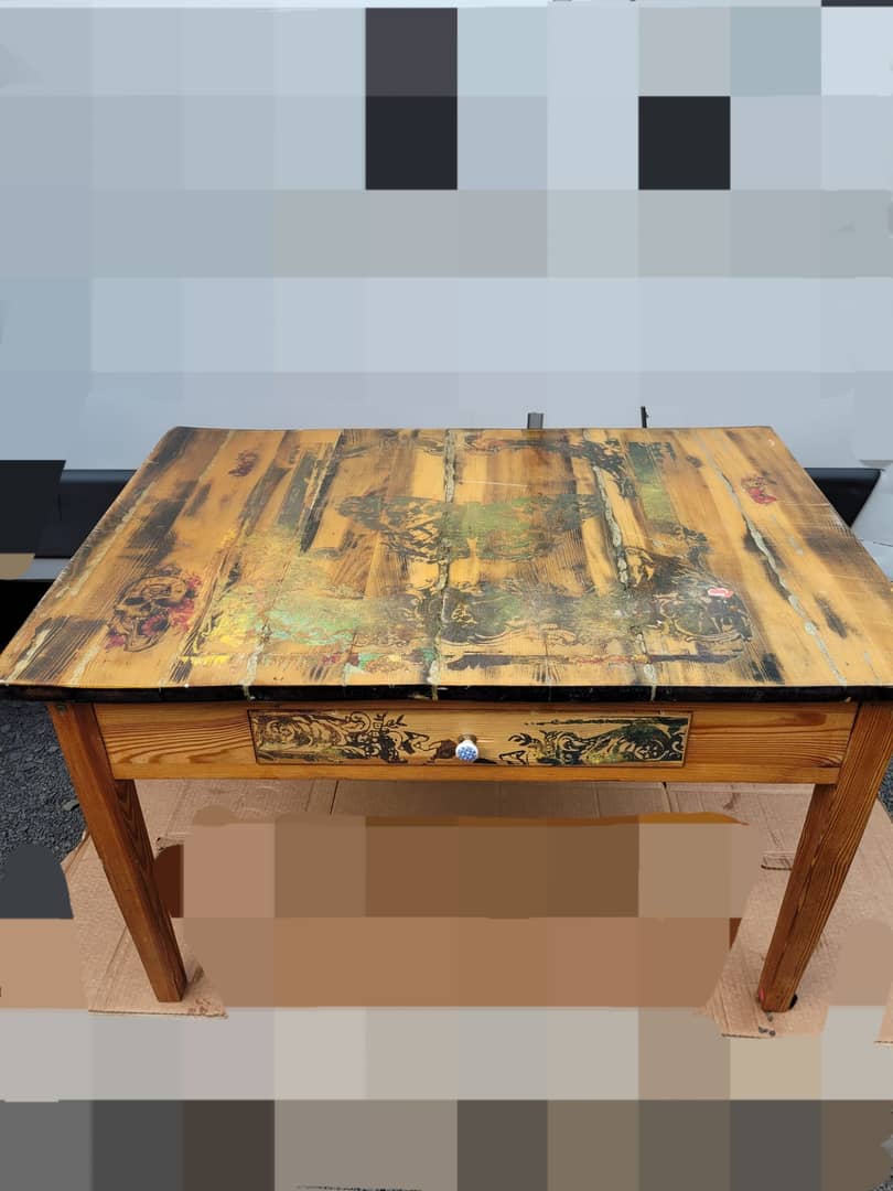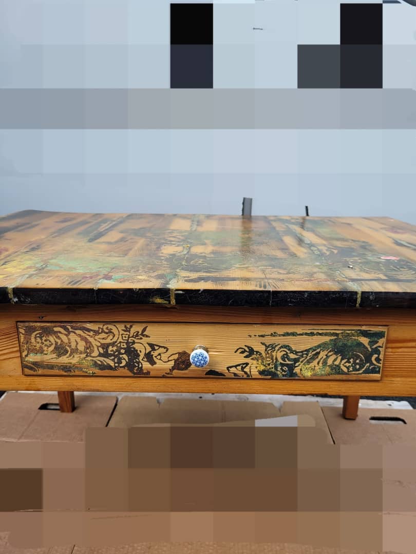 Stolik drewniany ręcznie zdobiony, z szufladką, długość 92 cm, szerokość 65 cm, wysokość 55 cm. Cena 300 zł. Możliwy transport.