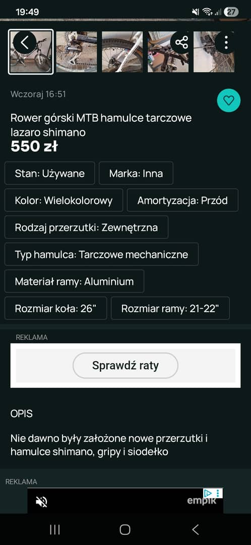 Nie dawno były założone nowe przerzutki i hamulce shimano, gripy i siodełko. Cena 600 zl