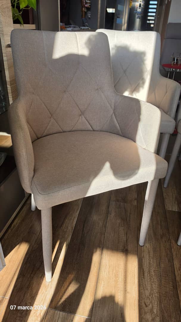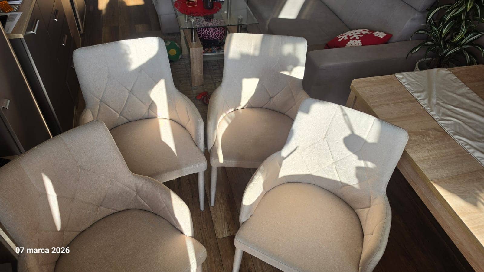 Sprzedam 4 sztuki zadbanych krzeseł tapicerowanych w kolorze beżowym idealnych do salonu, jadalni lub biura. Wymiary: