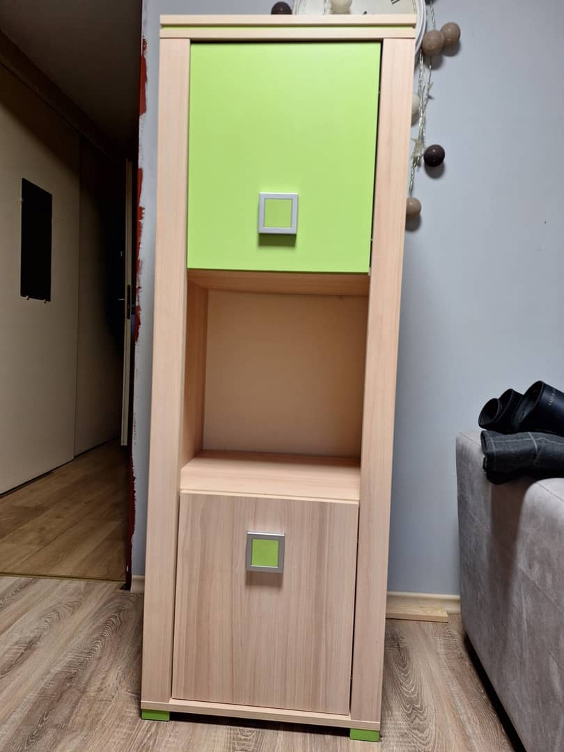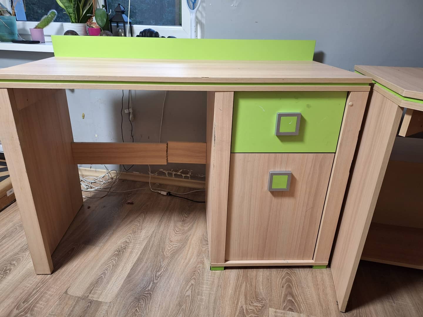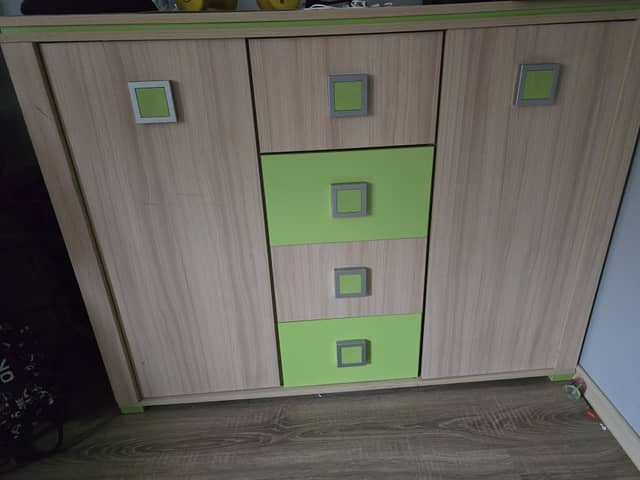 Sprzedam meble młodzieżowe jak na zdjęciach. Meble w dobrym stanie, niektóre do małych napraw. W skład kompletu wchodzi biurko narożne, biurko proste, szafka - regał, komoda, półka wisząca, szafka nocna. W biurku prostym jest do wymiany jedna listwa szeroka z tyłu ( jest na zdjęciu ). Cena za komplet.