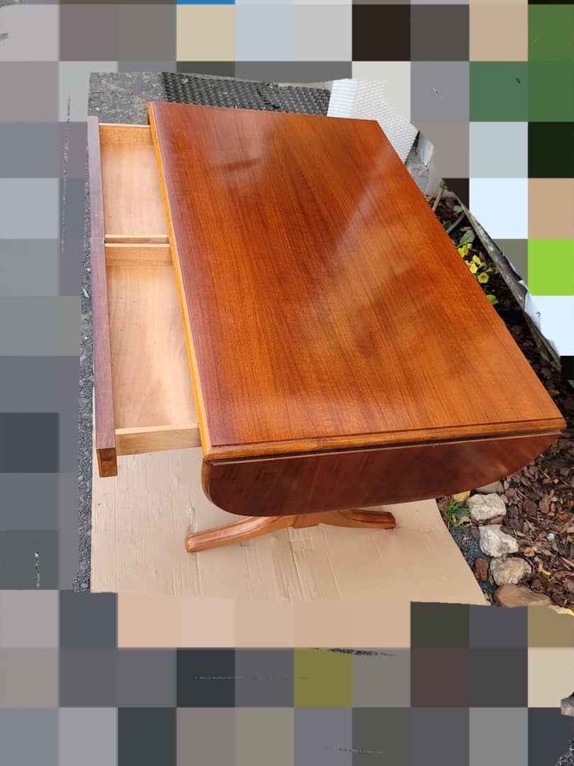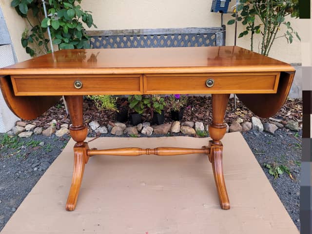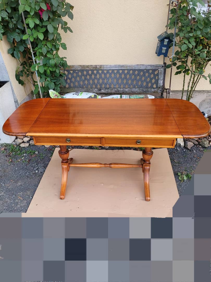 Stolik z szufladami, długość przed rozłożeniem boków 101 cm, długość całkowita 144 cm, szerokość 60 cm, wysokość 65 cm. Możliwy transport, cena 290 zl.